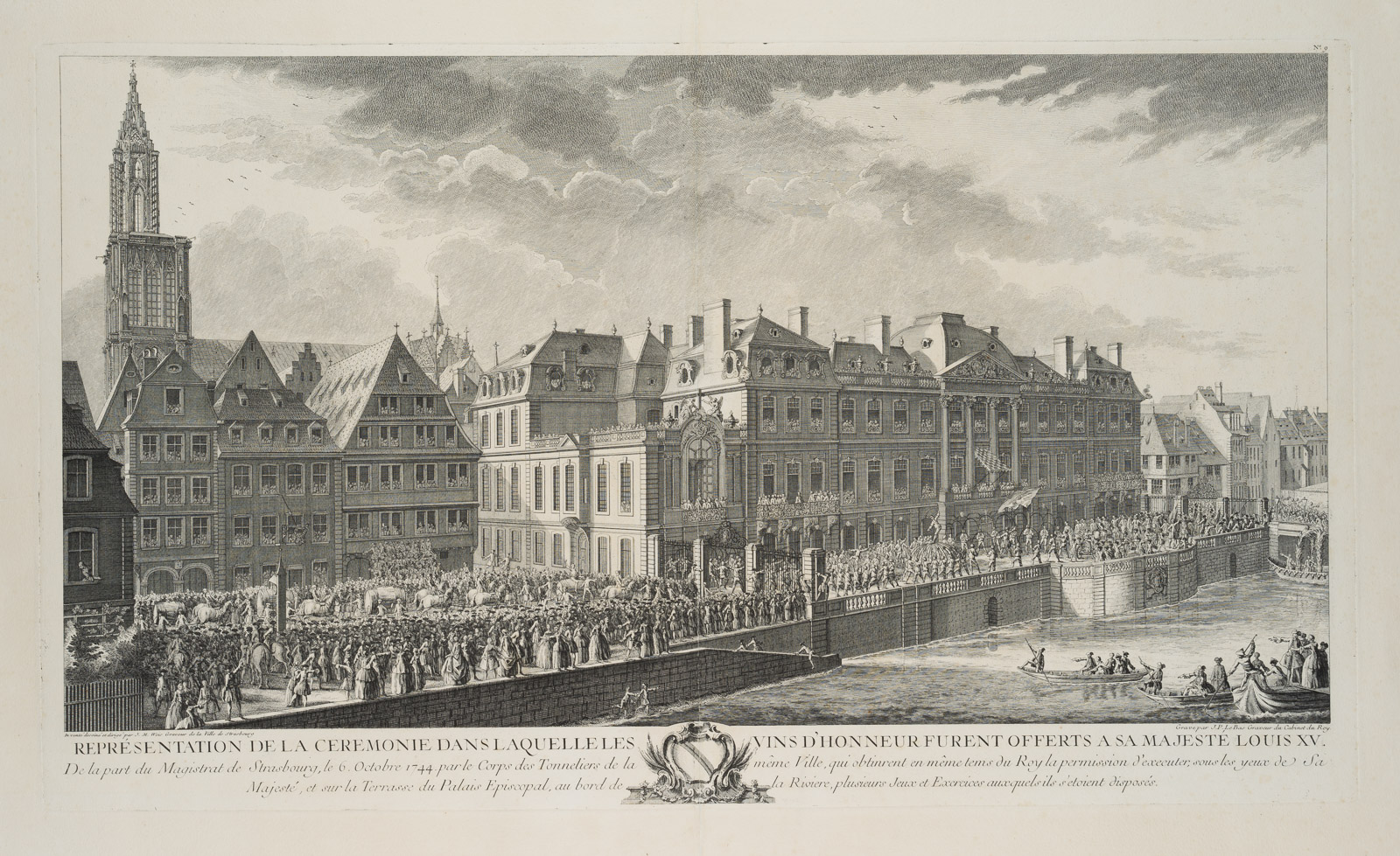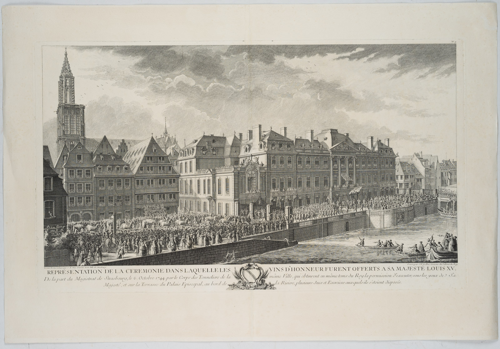 Jacques-Philippe le Bas (1707 Paris – 1783 ebd.) nach Johann Martin Weis (1711 Straßburg – 1751 ebd.), Feierlichkeiten zu Ehren Louis XV in Strasburg, “Représentation de la cérémonie dans laquelle les vins d’honneur furent offerts à sa Majesté Louis XV de la part du Magistrat de Strasbourg”, 1744, Kupferstich