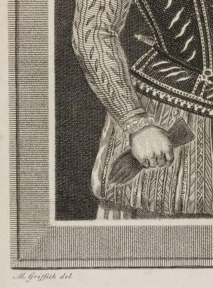 - Bezeichnung: Links unterhalb der Abbildung signiert mit “M. Griffith del.” und rechts mit “Basire Sc.”, darunter mit dem Namen des Dargestellten “SIR RICHARD CLOUGH, Knt.” bezeichnet.