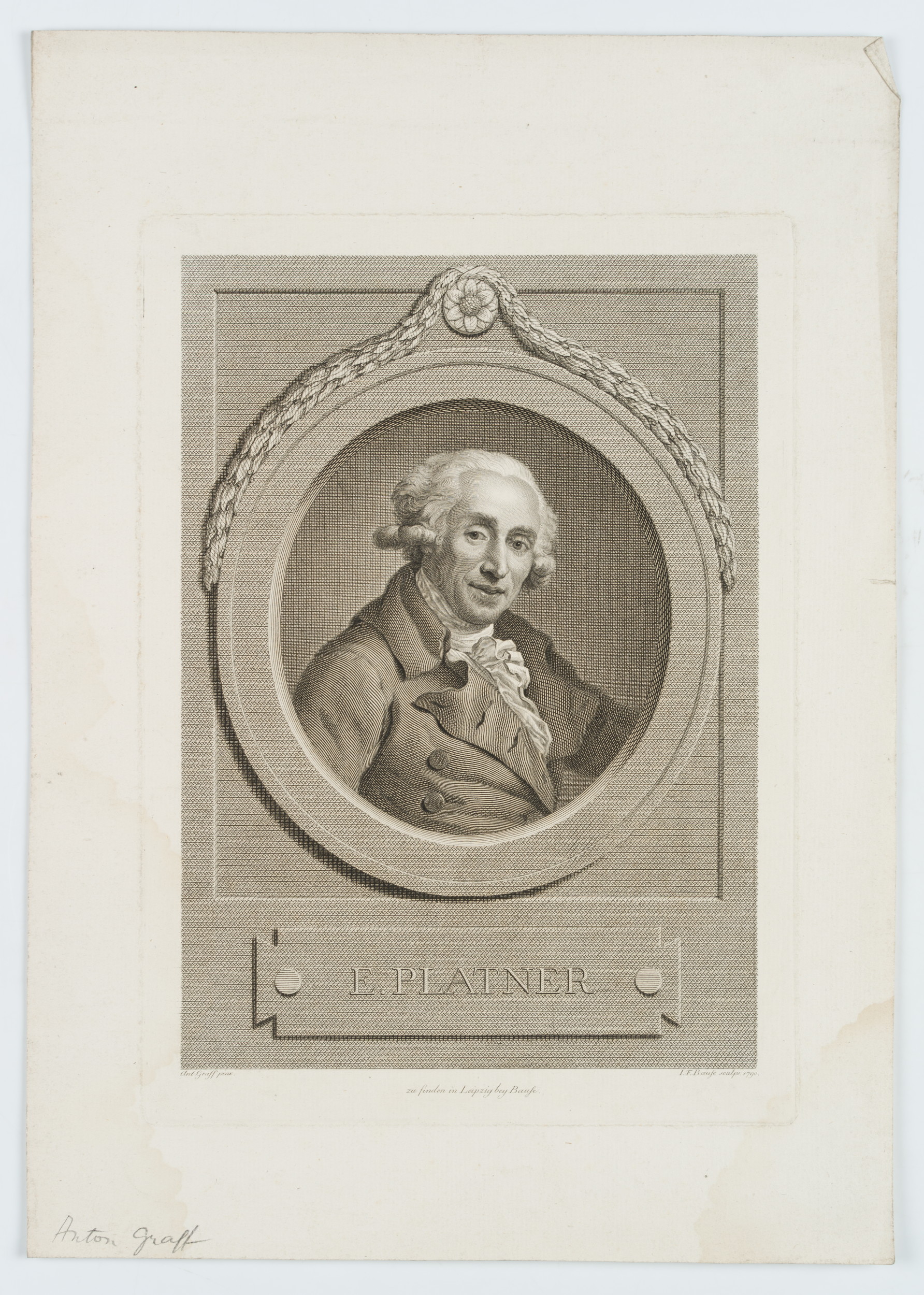 - Bezeichnung: Unten im Druck signiert: “Ant. Graff pinx | I. F. Bause sculps”. Unten rechts datiert: “1790”.