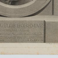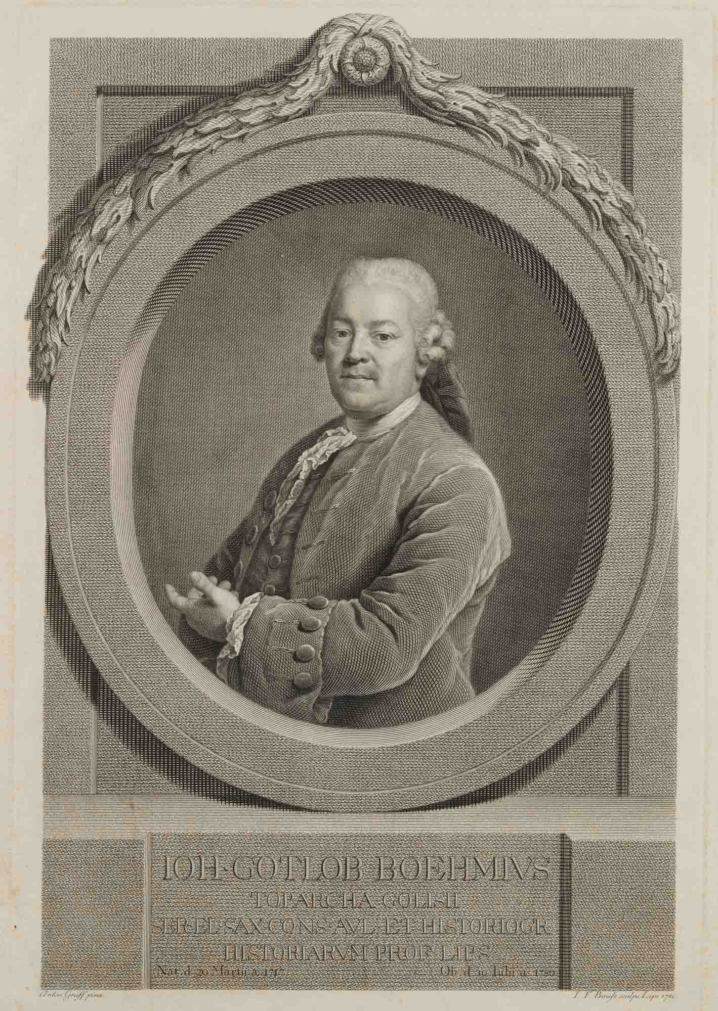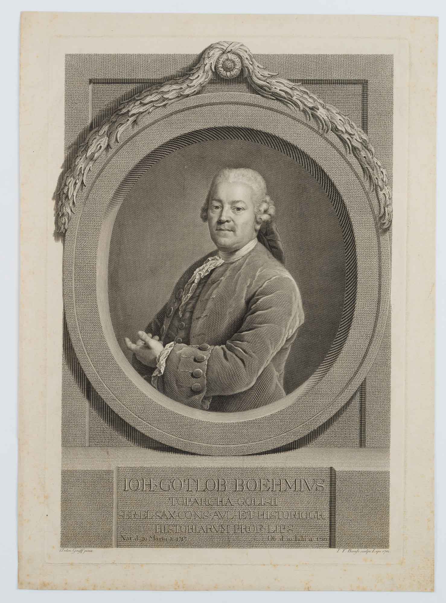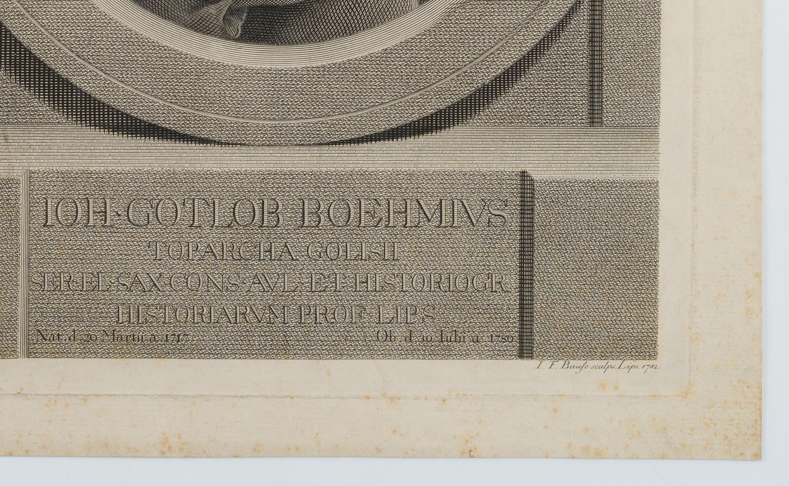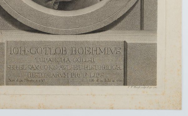 - Bezeichnung: Unterhalb des ovalen Rahmens mit Inschrifttafel, die den Namen des Dargestellten und Datierung trägt: “Ioh. Gotlob. Boehmius | Toparcha Golish | serel sax cons avl et historiogr historiarvm prof lips | Nat. d.20 Martii a. 1717 | Ob. D.30 lulii a 1780”. Darunter in der Druckplatte links und rechts signiert.