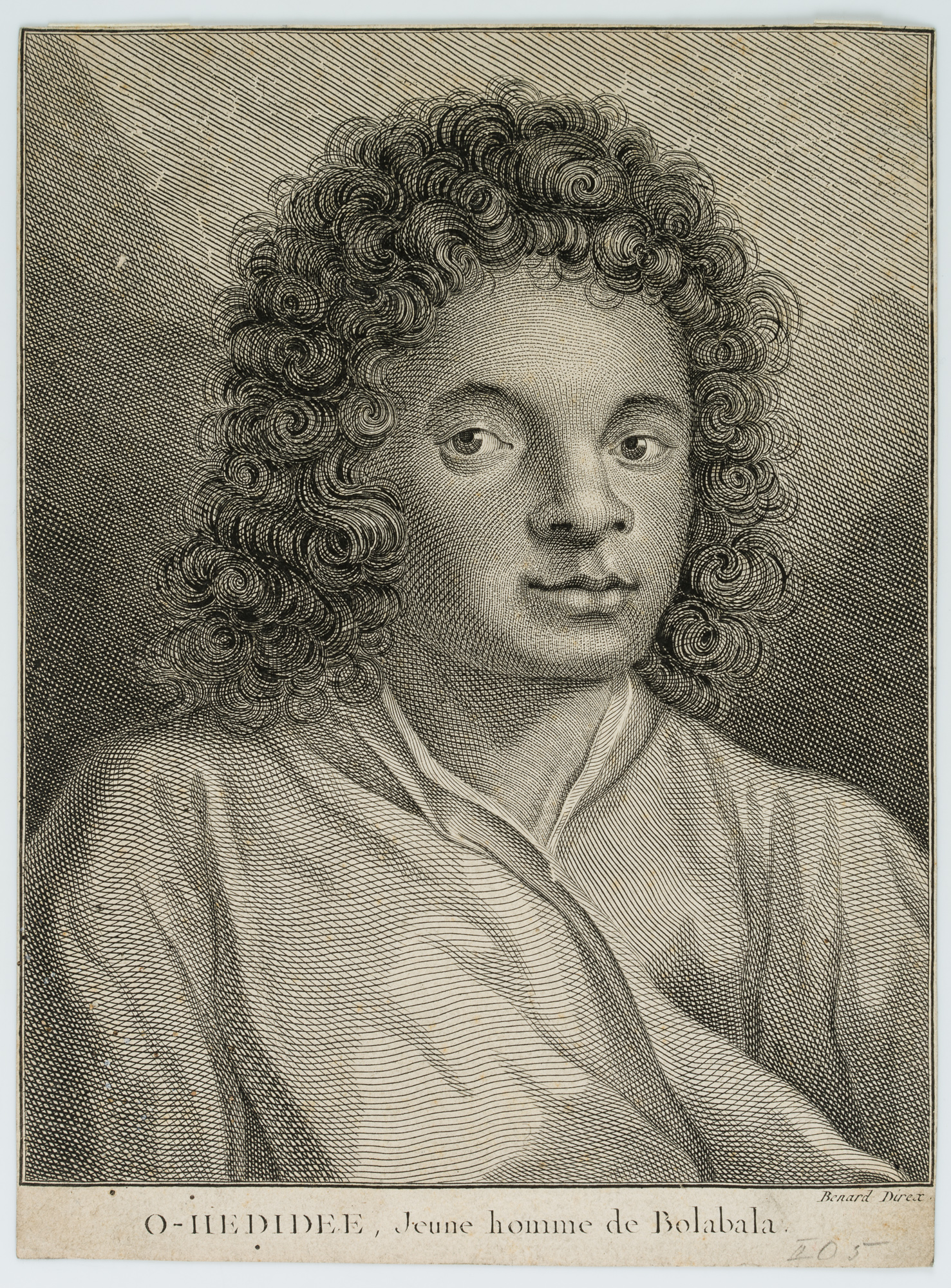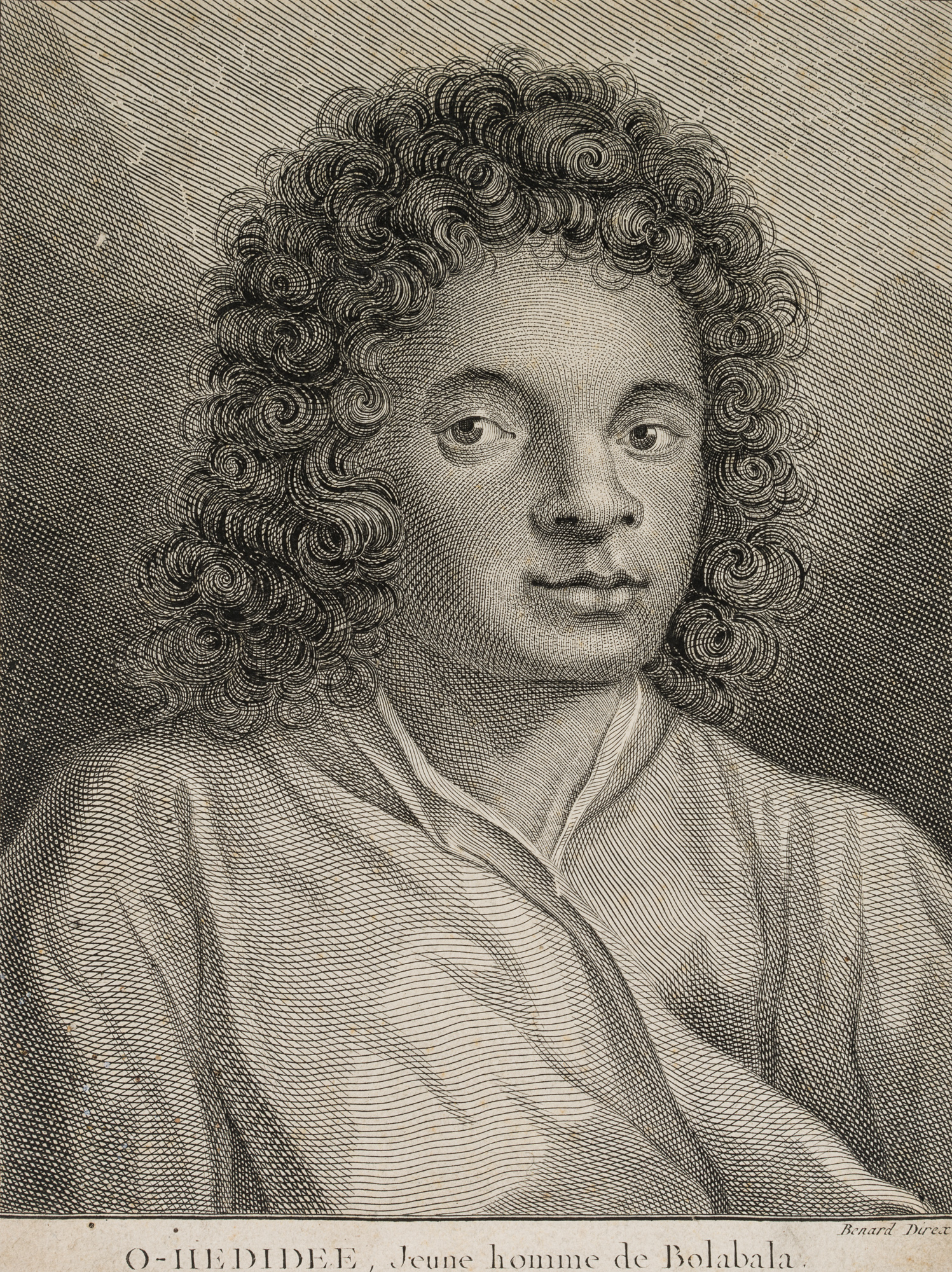 - Description: Signed by the artist below the depiction. Inscribed “O-HEDIDEE, Jeune homme de Bolabala” Half-length portrait of a young man, facing the viewer without meeting his gaze. Extremely sharply engraved copper engraving. Enchanting depiction of the curls and fine shading.