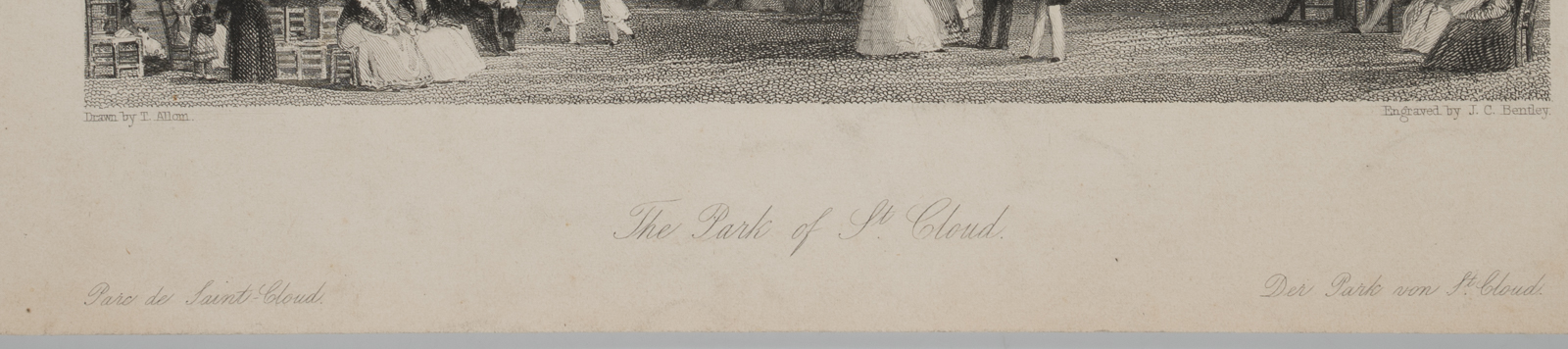- Bezeichnung: Links unten signiert mit “Drawn by T. Allom.” und rechts signiert mit “Engraved by J. C. Bentley.”, darunter beschriftet mit “The Park of St. Cloud.”.