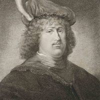 - Beschreibung: Bruststück nach rechts mit Blick hin zum Betrachter. Der Dargestellte von kräftiger Statur trägt einen Federhut und einen am Saum kostbar verzierten Umhang.