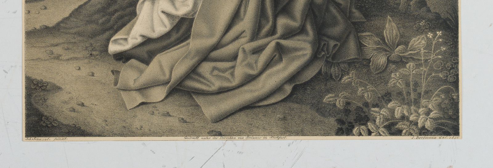 - Bezeichnung: Links und rechts unterhalb der Darstellung signiert und datiert. Mit Angabe: “Gedruckt unter der Direktion von Strixner in Stuttgart”. Das Blatt stammt aus der mehrbändigen Ausgabe: Die Sammlung Alt-, Nieder- und Ober-Deutscher Gemälde der Brüder Sulpiz und Melchior Boisserée und Johann Bertram (1821-1836).