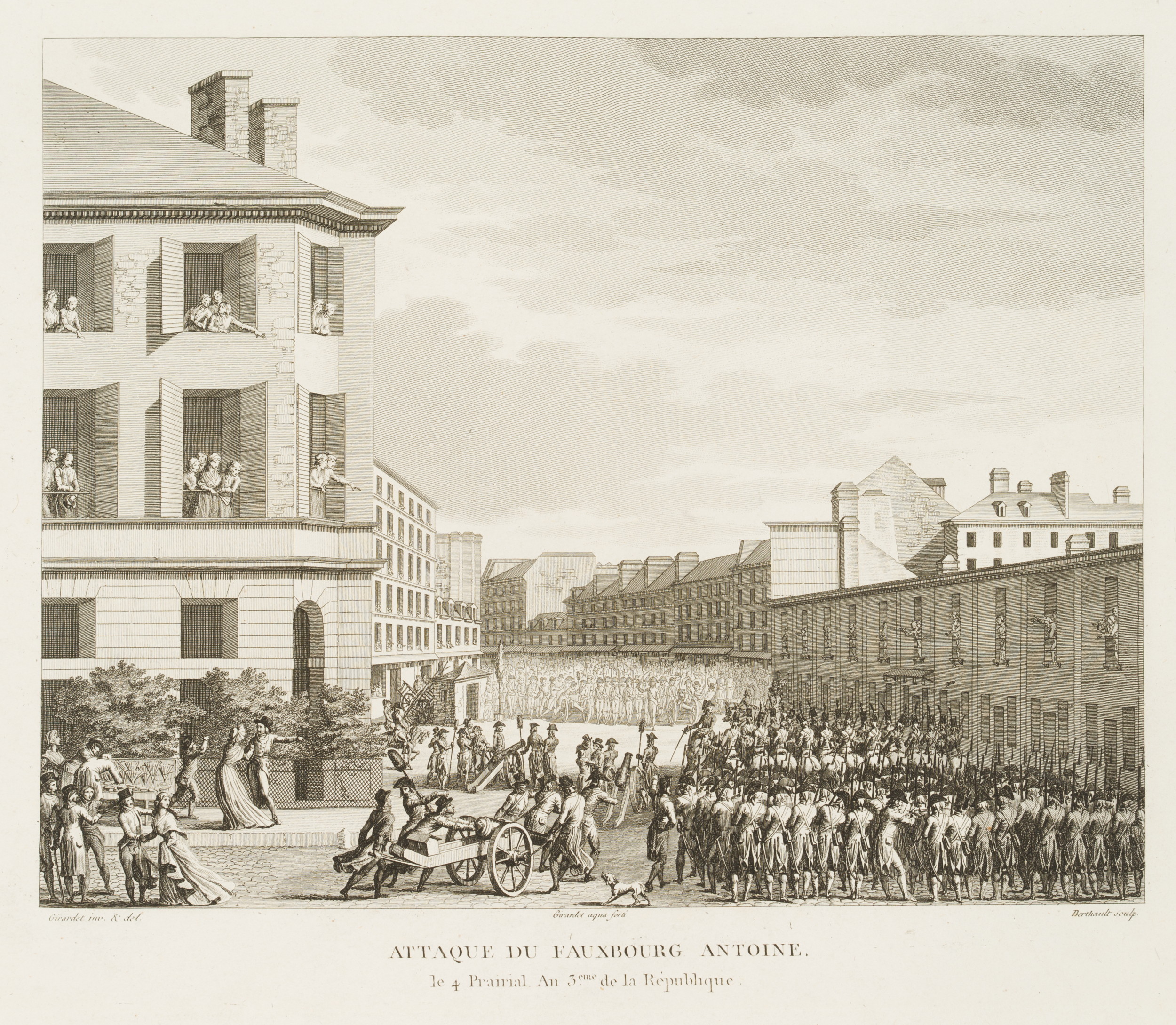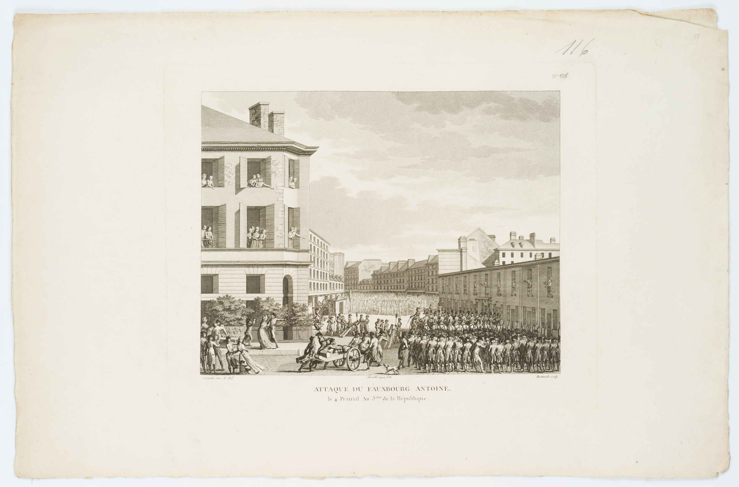 - Inscription: At the lower part signed in the printing plate: “Girardet inv. & del. | Girardet aqua forti | Berthault sculp.”. At the lower part inscribed in the printing plate: “Attaque du Fauxbourg Antoine. le 4 Prairial. An 3.eme de la République”.