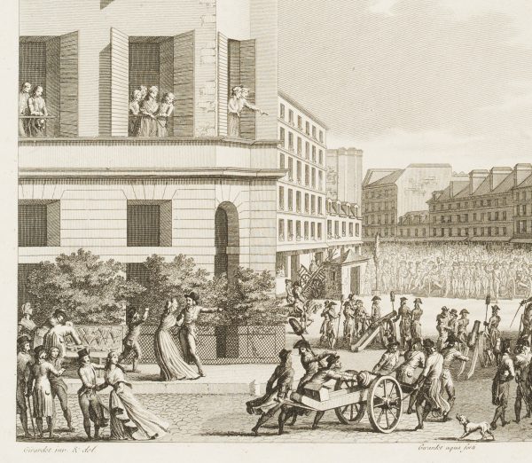 - Bezeichnung: Unten im Druck signiert: “Girardet inv. & del. | Girardet aqua forti | Berthault sculp.”. Unten im Druck bezeichnet: “Attaque du Fauxbourg Antoine. le 4 Prairial. An 3.eme de la République”.