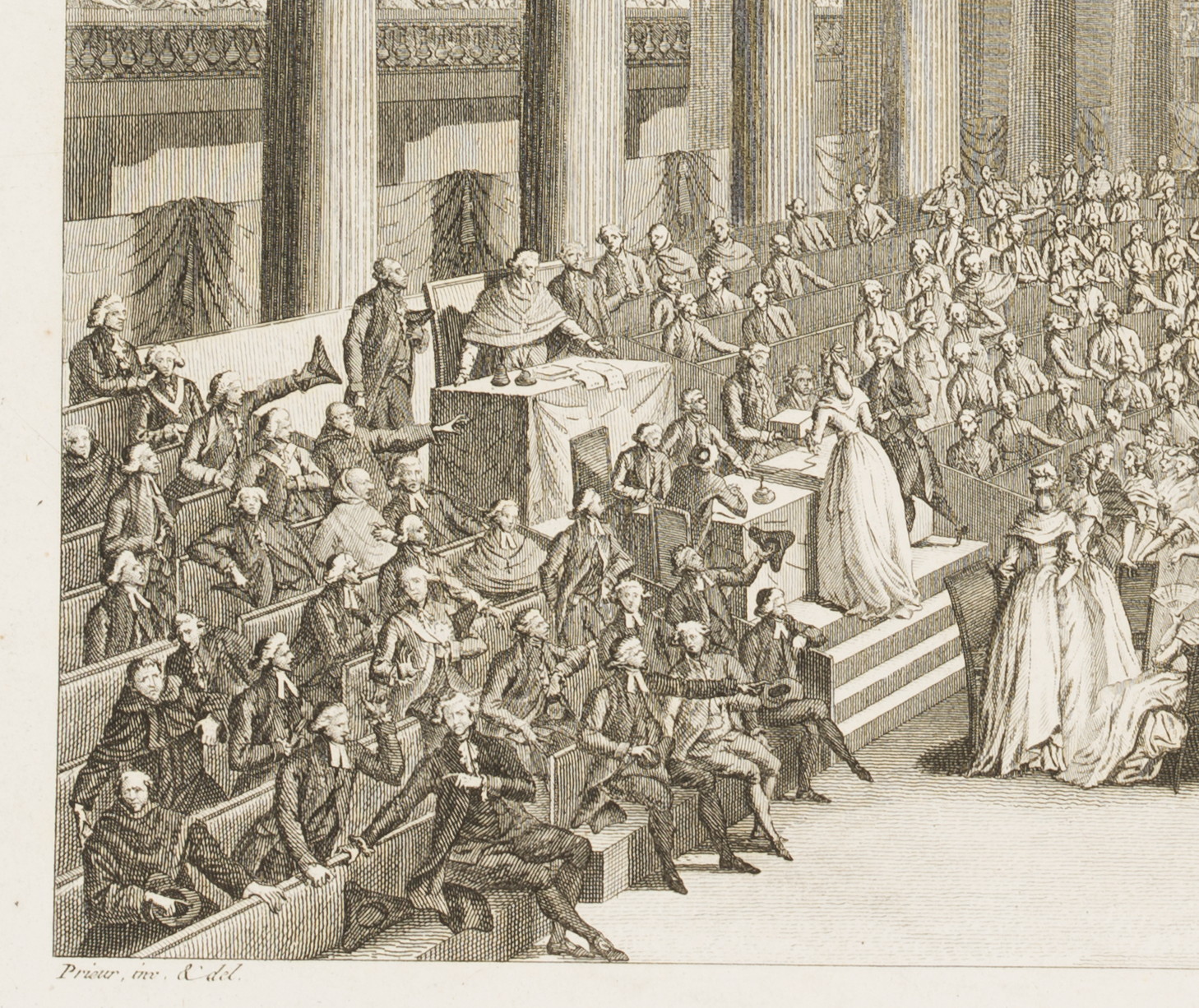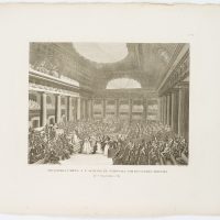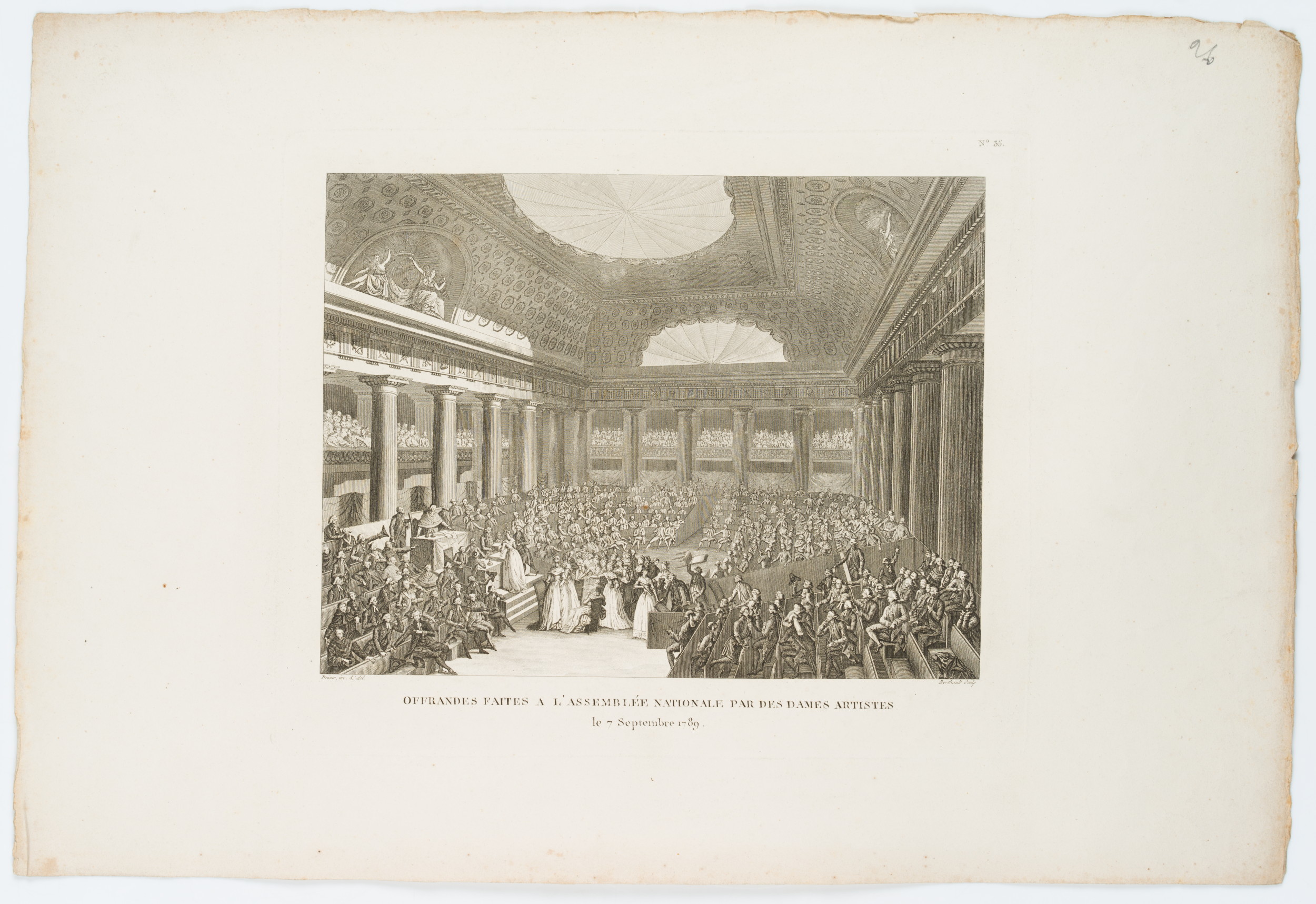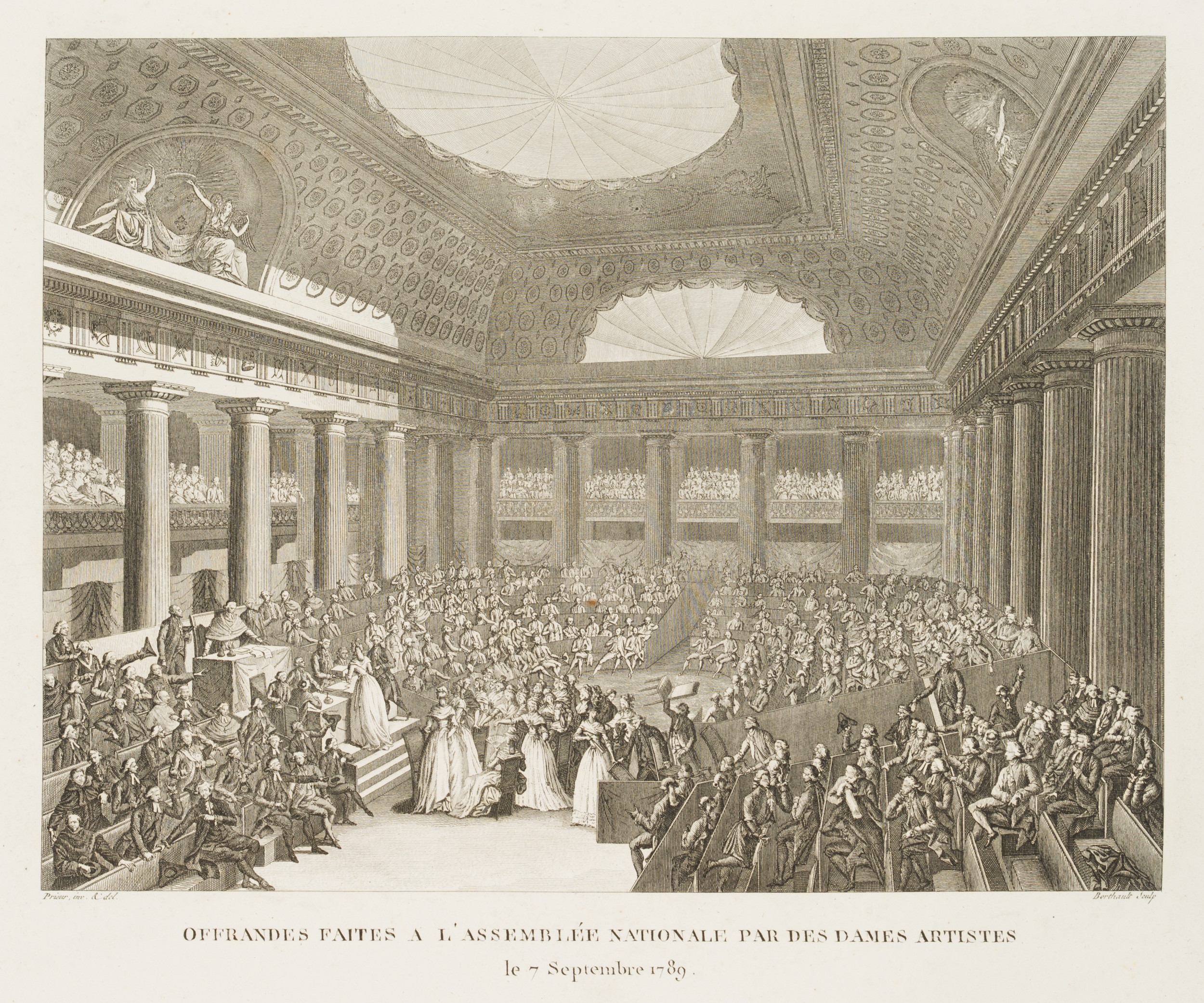 • Inscription: At the lower part signed in the printing plate: “Prieur inv. & del. |Berthault sculp.”. At the lower part inscribed in the printing plate: “Offrandes faites a l’Assemblée Nationale par des Dames Artistes / le 7 September 1789”.