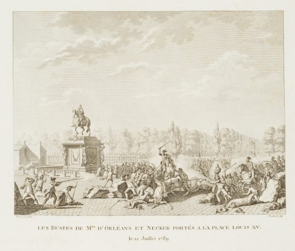 - Bezeichnung: Unten im Druck signiert: “Prieur inv. & del. | Berthault sculp”. Unten im Druck bezeichnet: “Les Bustes de Mrs d’Orléans et Necker portés a la Place Louis XV. / le 12 Juillet 1789”.