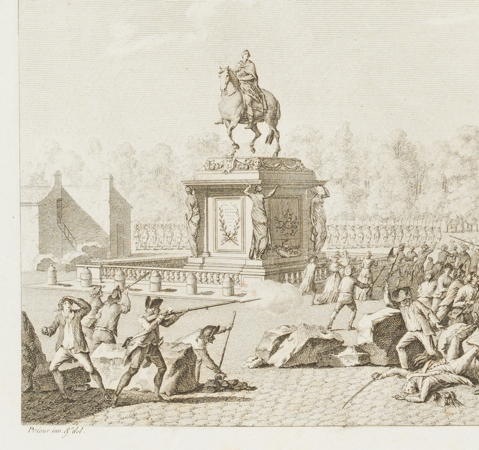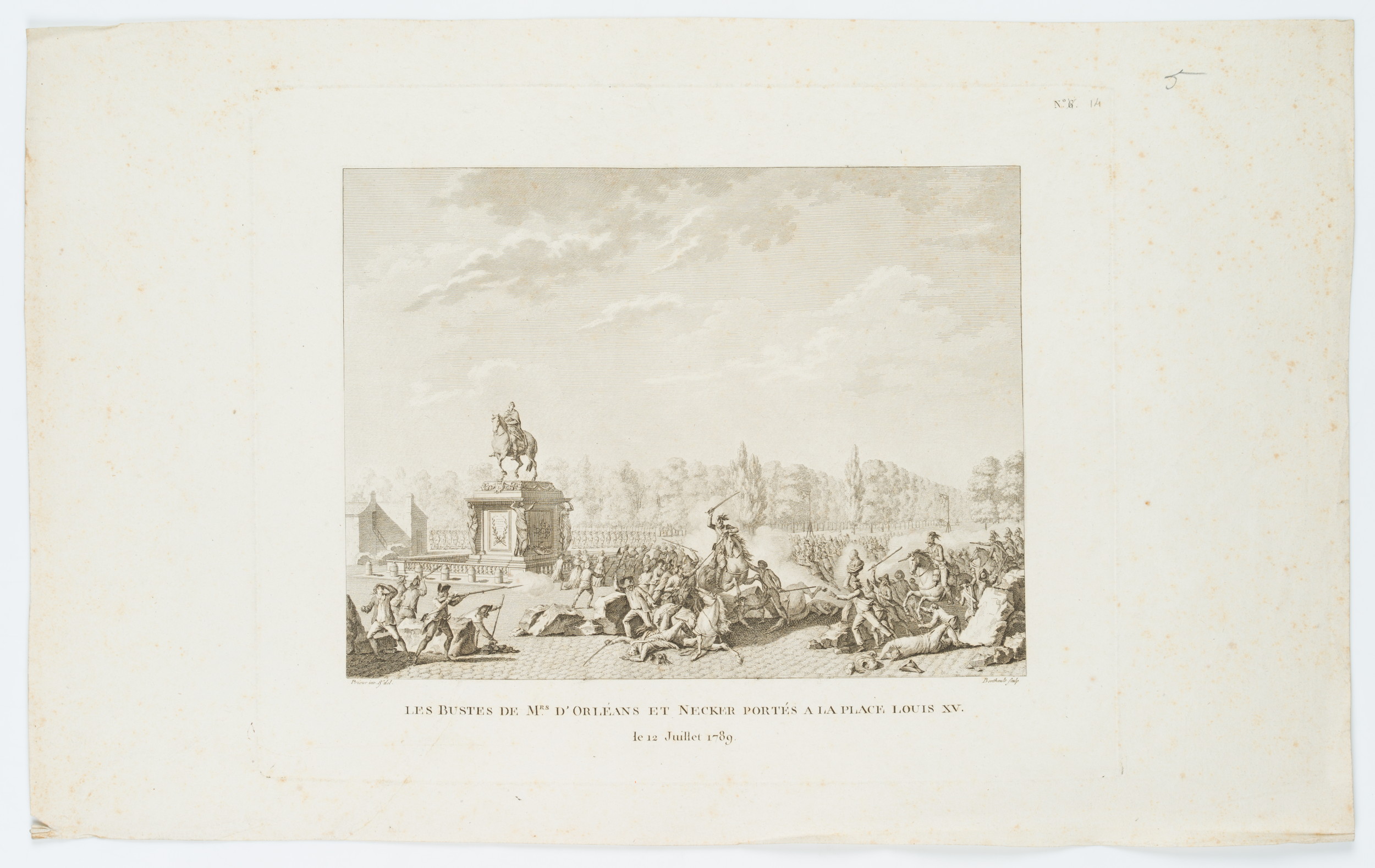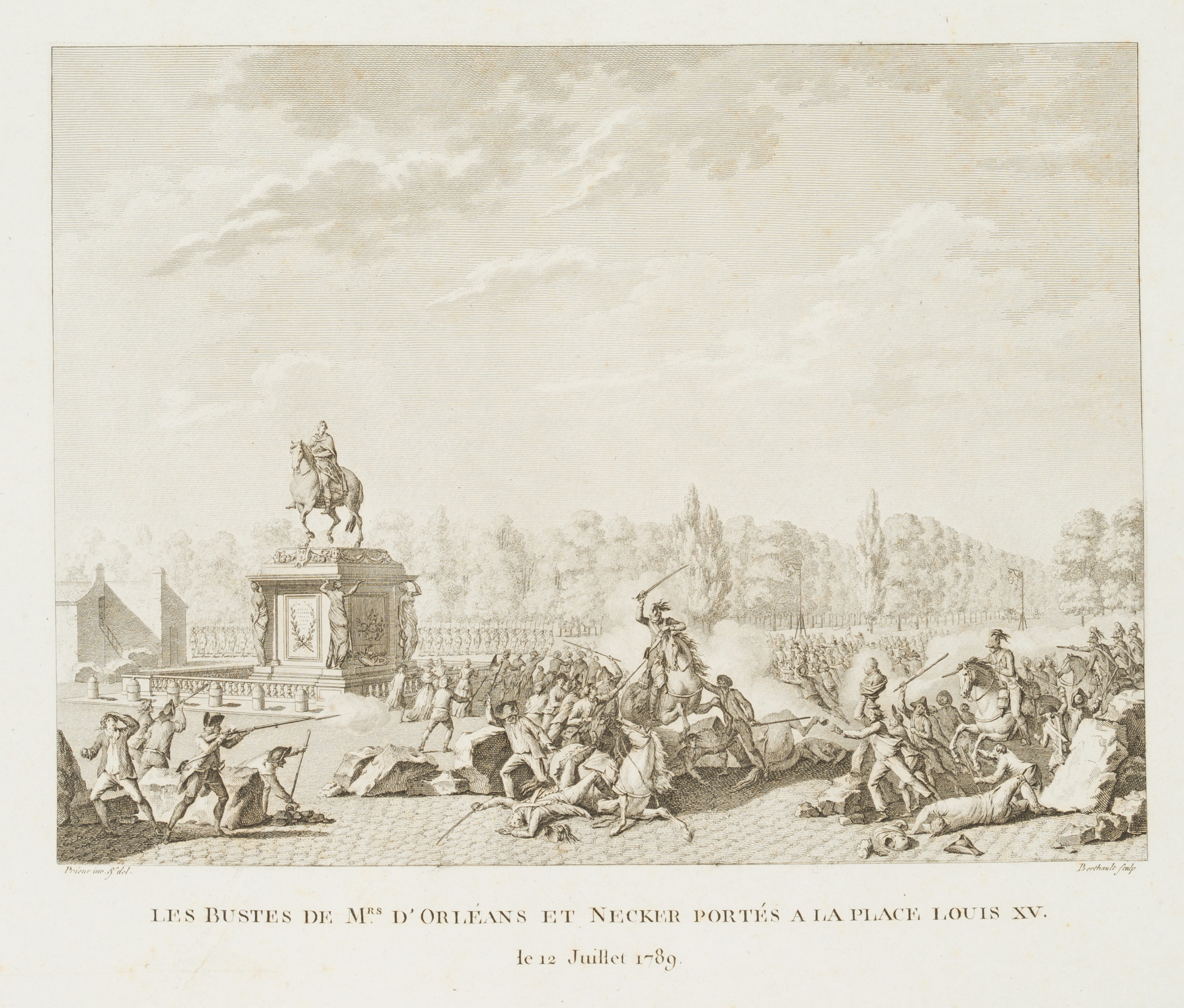 - Inscription: At the lower part signed in the printing plate: “Prieur inv. & del. | Berthault sculp”. At the lower part inscribed in the printing plate: “Les Bustes de Mrs d’Orléans et Necker portés a la Place Louis XV. / le 12 Juillet 1789”.