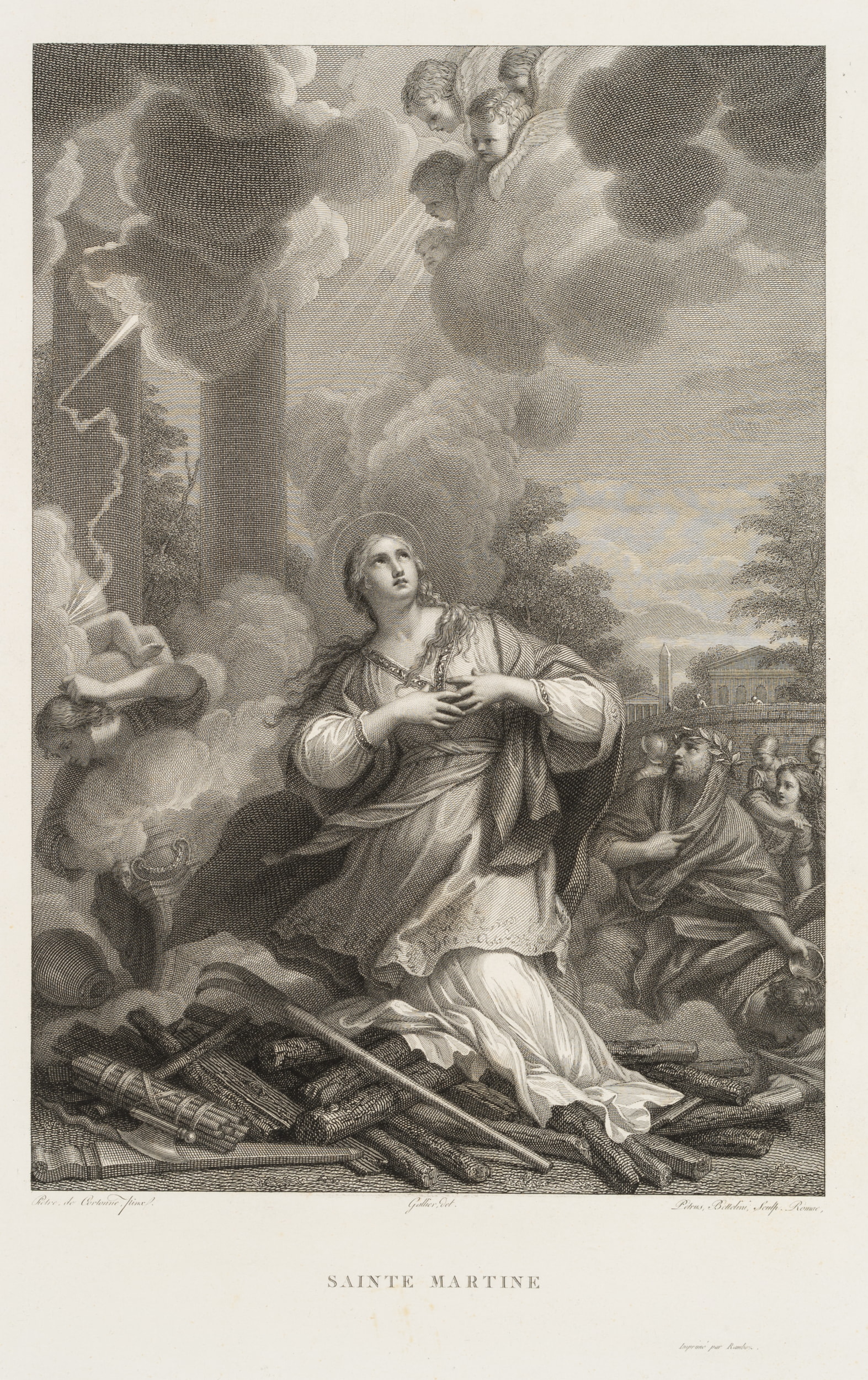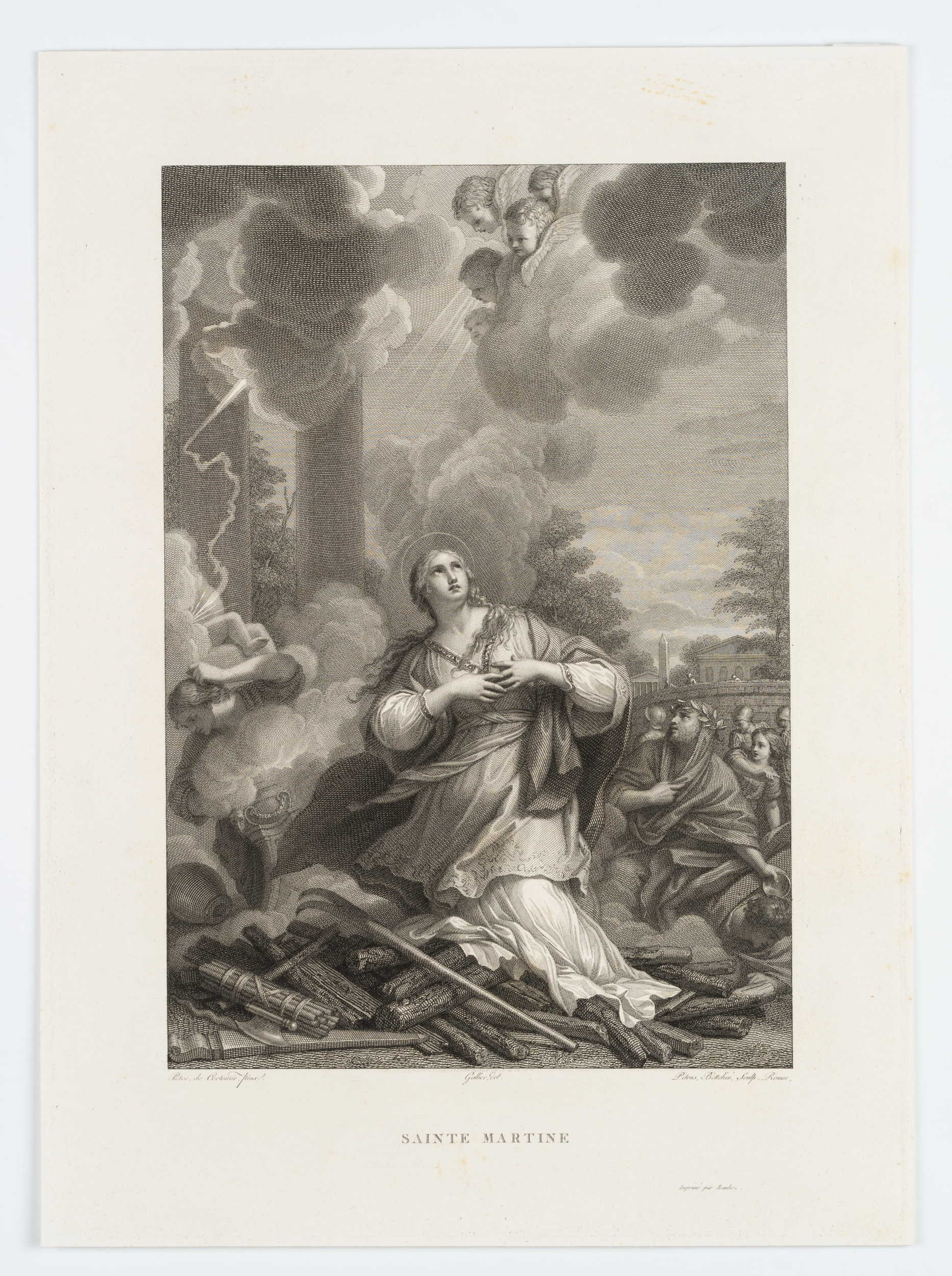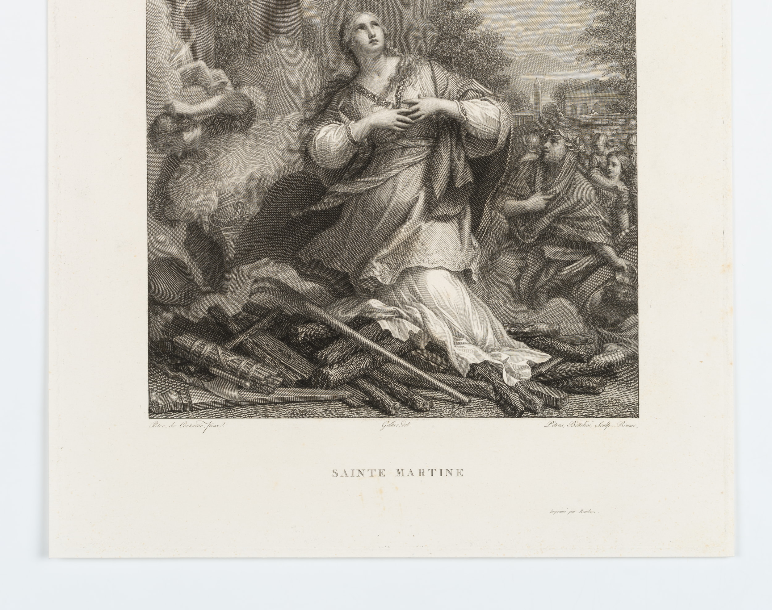 - Inscription: Lower middle signed in the printing plate: “Pietre, de Cortonne, pinx | Gallier del | Petrus, Bettelini, Sculp. Romae”. Lower middle inscribed in the printing plate: “SAINTE MARTINE”.