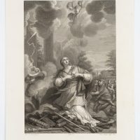 Petrus Bettelini (1763 – 1829 ) after Pietro da Cortona (before 1597 Cortona – 1669 Rom), Depiction of the saint Martina on the funeral pyre with angels on a cloud and lightning bolts striking from the sky, 19th century, Copper engraving