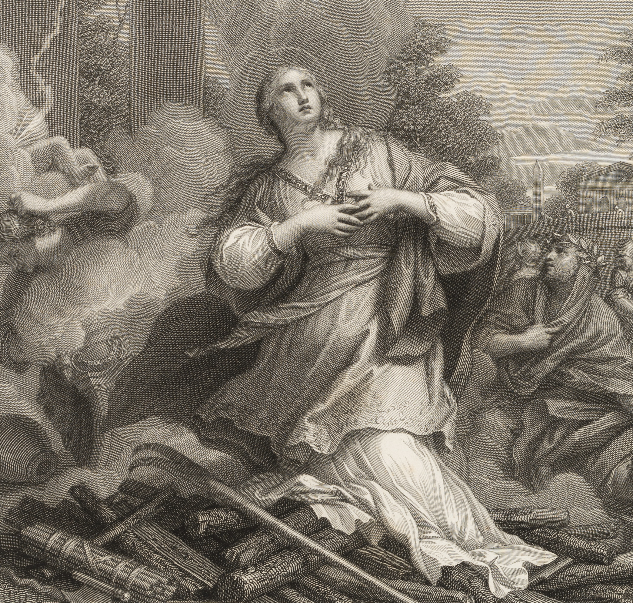 Petrus Bettelini (1763 – 1829 ) nach Pietro da Cortona (vor 1597 Cortona – 1669 Rom), Heiligendarstellung der Märtyrerin Martina auf dem Scheiterhaufen mit Engeln auf Wolke und Blitze, die vom Himmel schlagen, 19. Jahrhundert, Kupferstich