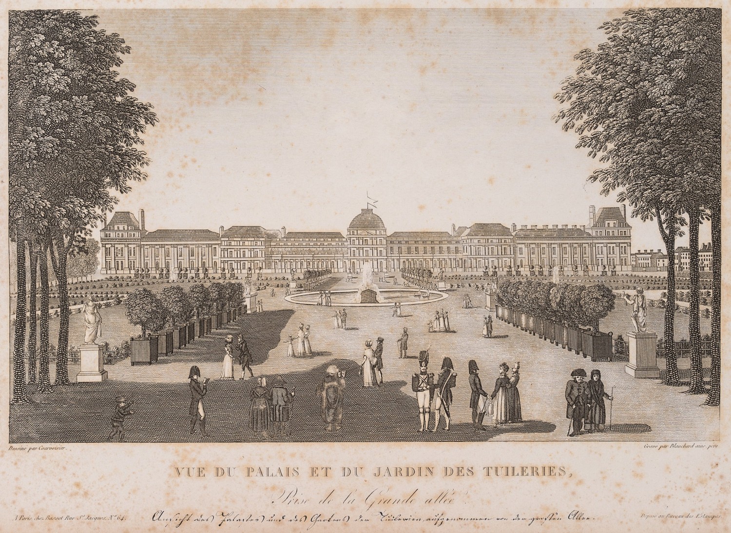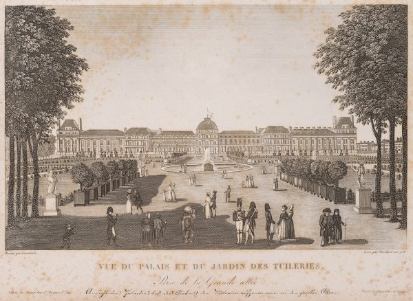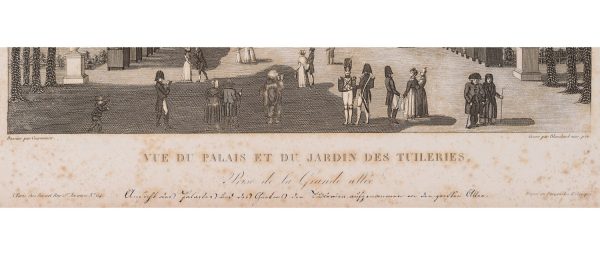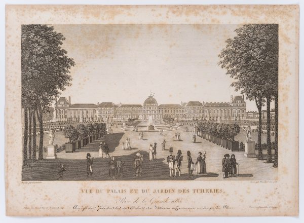 - Inscription: Signed and titled in the printing plate below the image: “Vue du Palais et du Jardin des Tuileries”, below titled in ink in German by a foreign hand