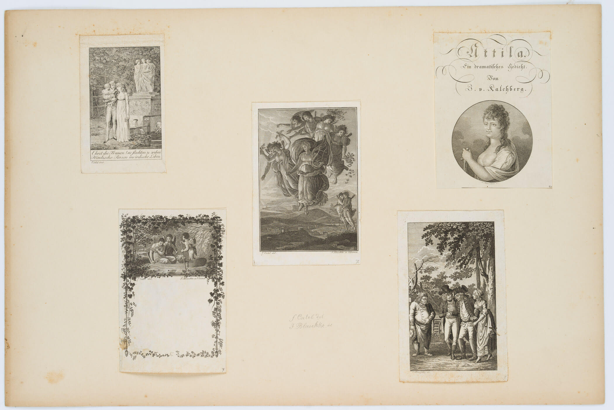 Blatt links oben zeigt eine junge Familie in einem Garten mit Monument, auf dem die Skulptur der drei Grazien steht. Unten beschriftet mit den ersten beiden Versen aus dem Gedicht ‘Würde der Frauen’ von Friedrich Schiller. Auf dem Blatt in der Mitte fliegt eine weibliche Gottheit mit Gefolge über das weite Land. Oben rechts das Titelkupfer mit einem weiblichen Heroinenportrait zum Werk ‘Attila. Ein dramatisches Gedicht von J. v. Kalchberg’.