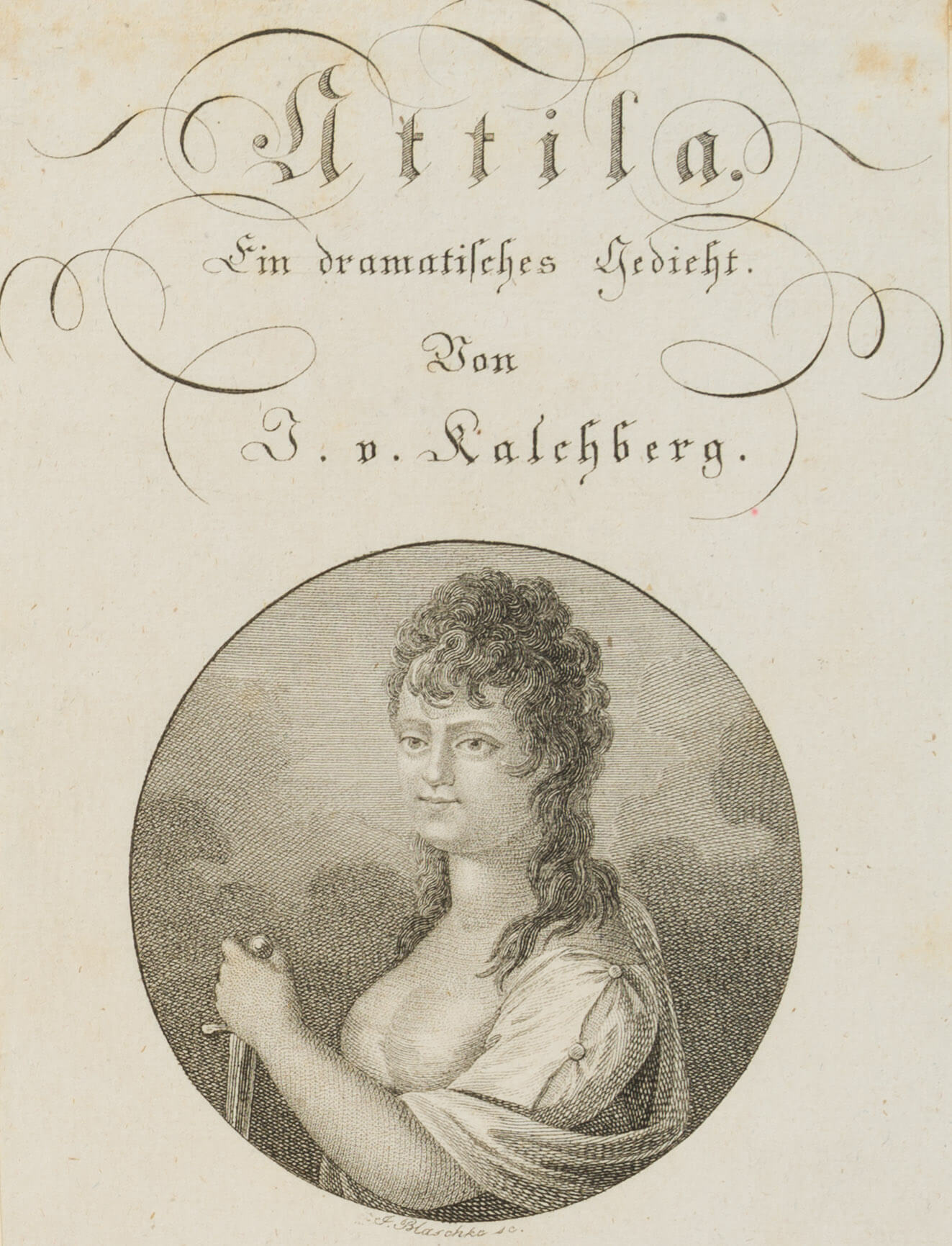 • Description: Sheet top left shows a young family in a garden with a monument on which the sculpture of the Three Graces stands. Below inscribed with the first two verses from the poem ‘Dignity of Women’ by Friedrich Schiller. On the sheet in the centre a female deity with retinue flies over the vast land. Above right the title copperplate with a female heroine portrait to the work ‘Attila. A dramatic poem by J. v. Kalchberg’.