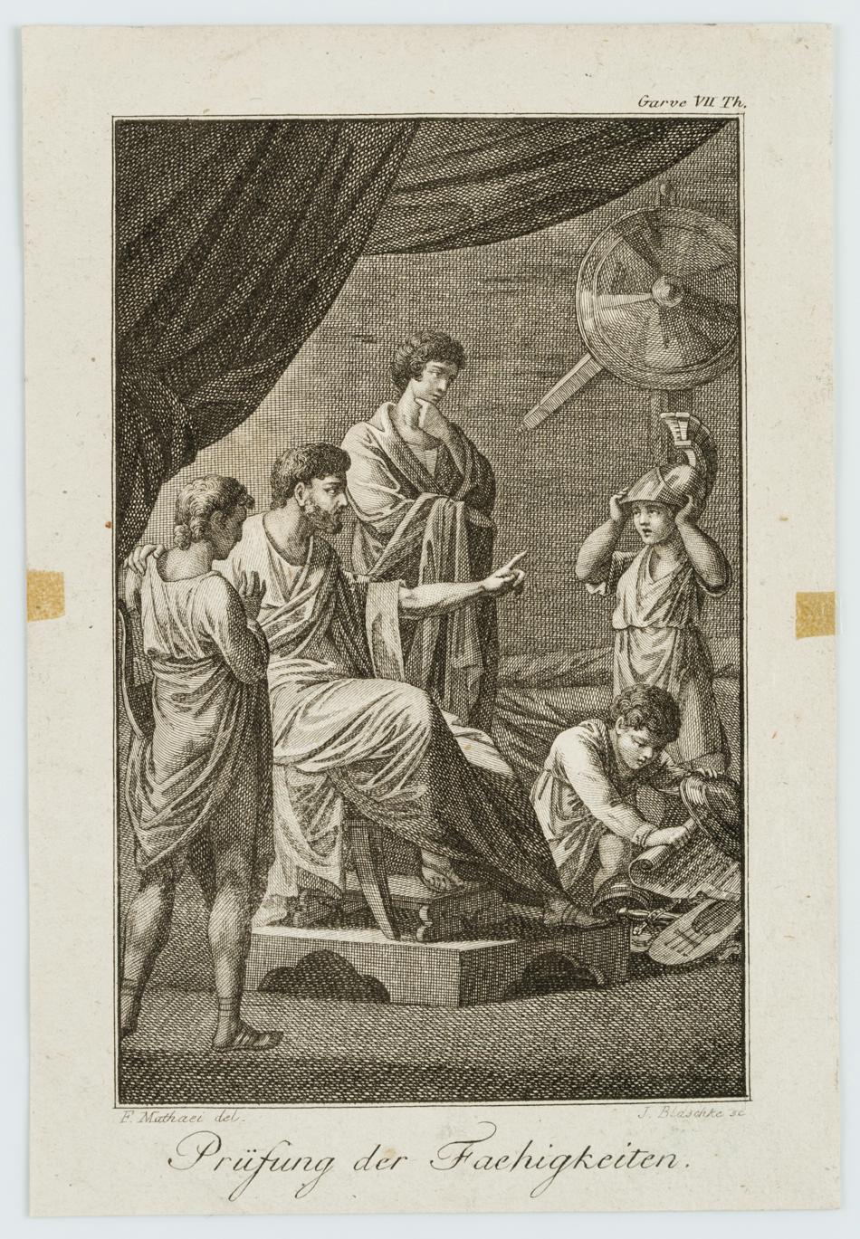 - Beschreibung: Nach einer Vorlage von Friedrich Matthäi (1777 Meißen – 1845 Wien). Diese antikisierende Miniatur zeigt einen Lehrer, der die Fähigkeiten einiger junger Knaben prüft und bewertet. Vor ihm liegt ein Stapel mit Musikinstrumenten und Kriegsgerät, aus dem die Jungen sich die bevorzugten “Attribute” auswählen. So wird die Fähigkeit der heranwachsenden geprüft, ob sie eher zum Dichter oder Krieger taugen.