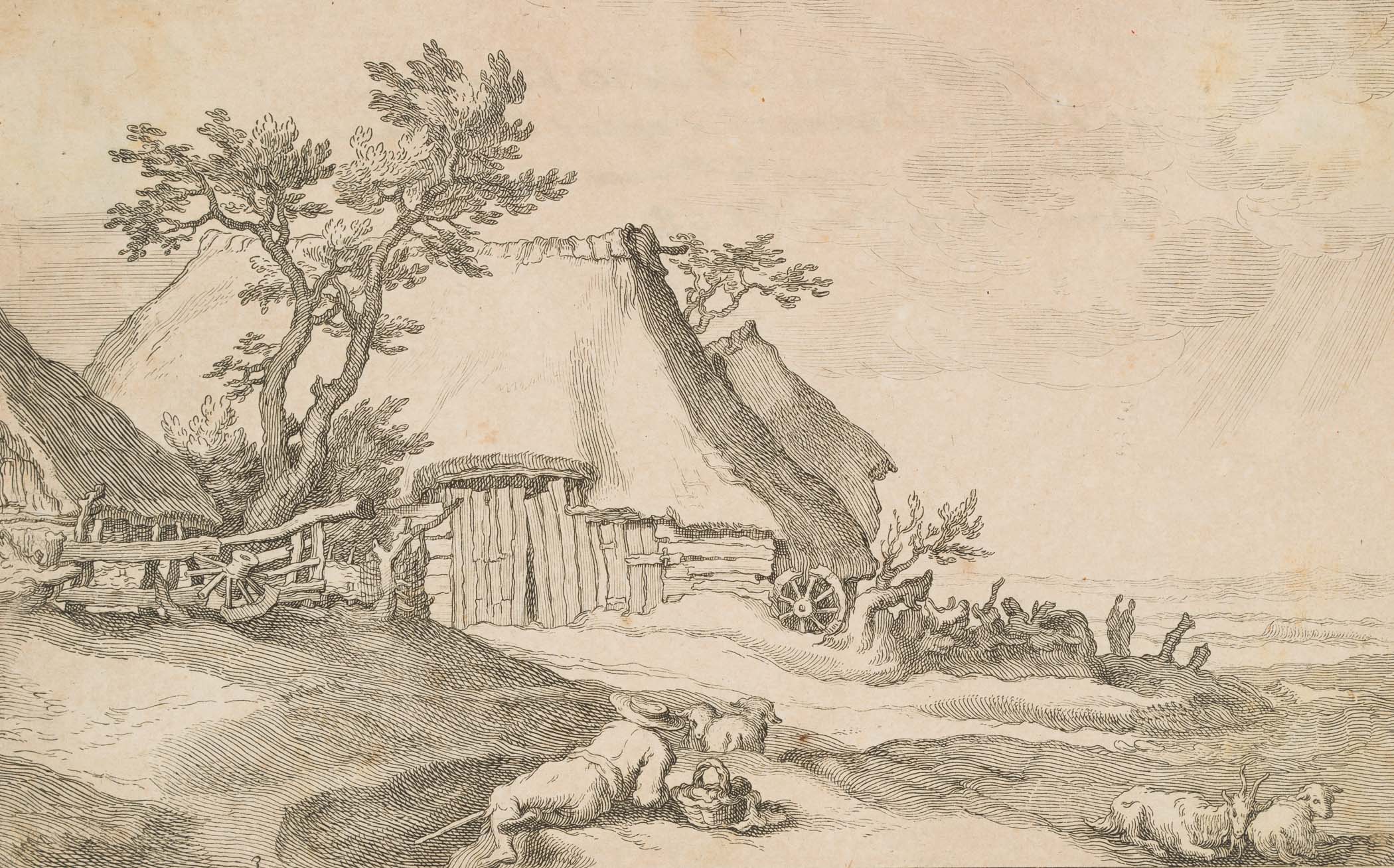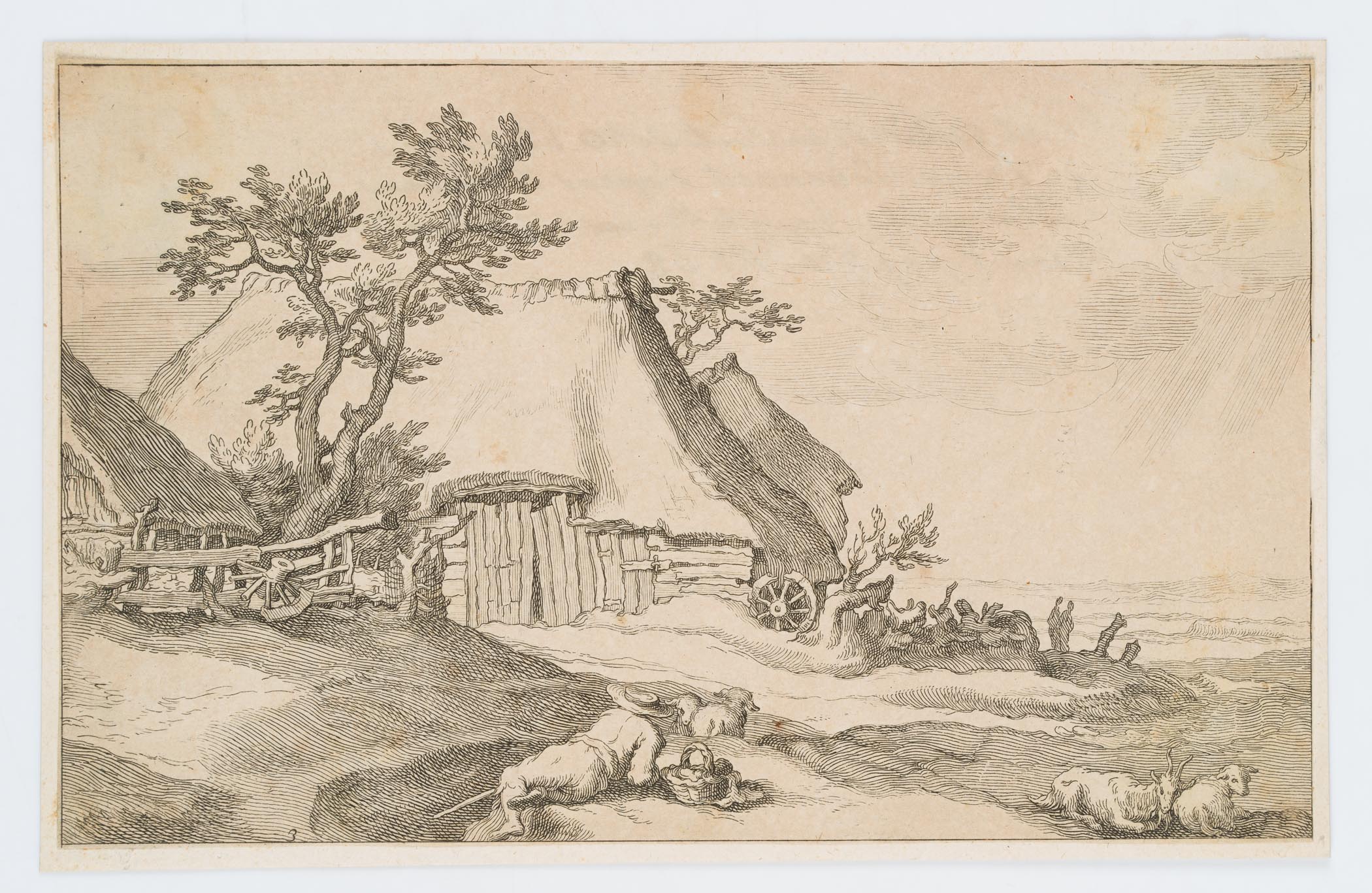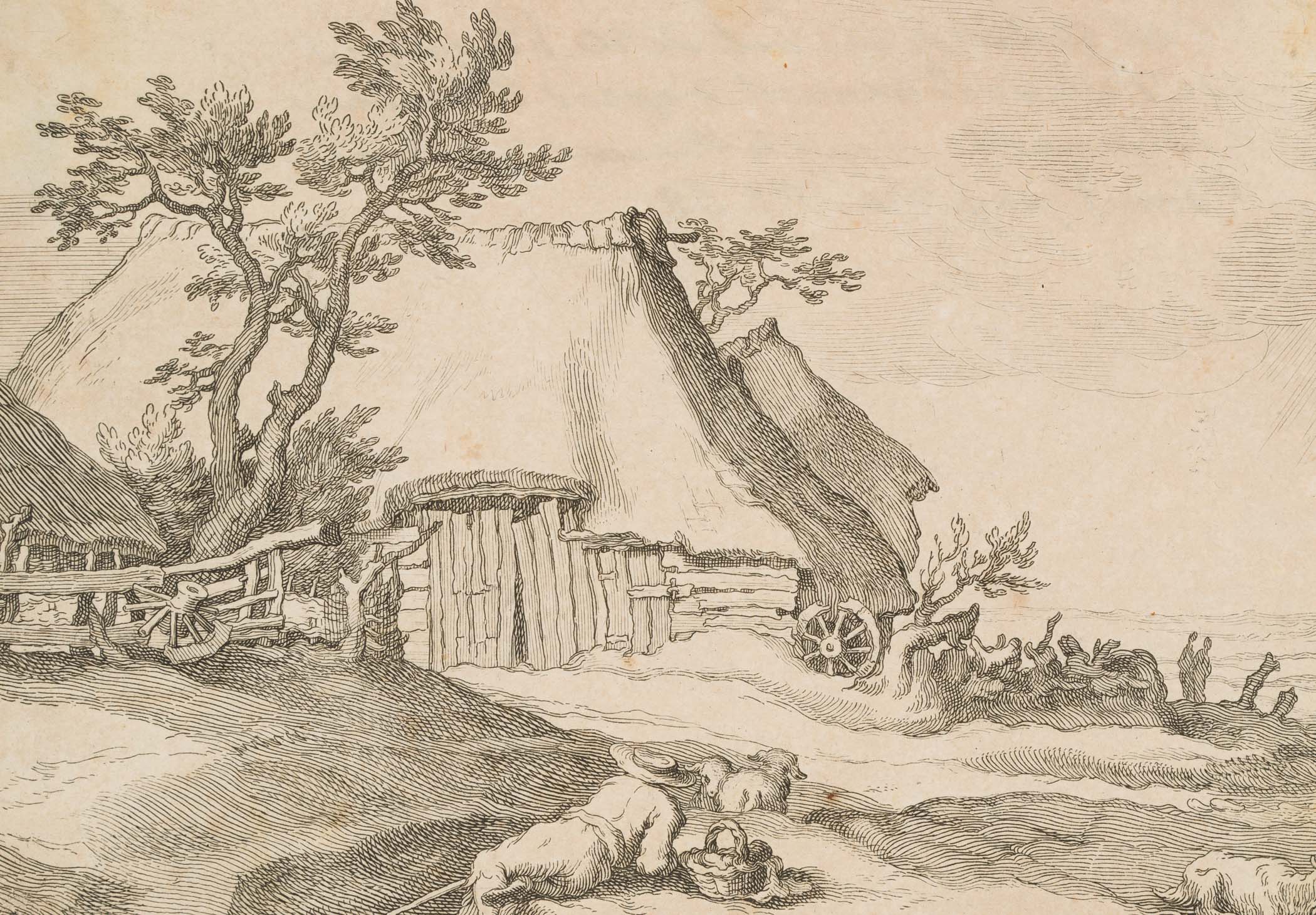 Frederik Bloemaert (um 1614 Utrecht – 1690 ebd.) nach Abraham Bloemaert (1566 Dordrecht – 1651 Utrecht), Szene auf dem Land mit Bauernkarte und rastendem Hirte mit Schafen , um 1660, Radierung