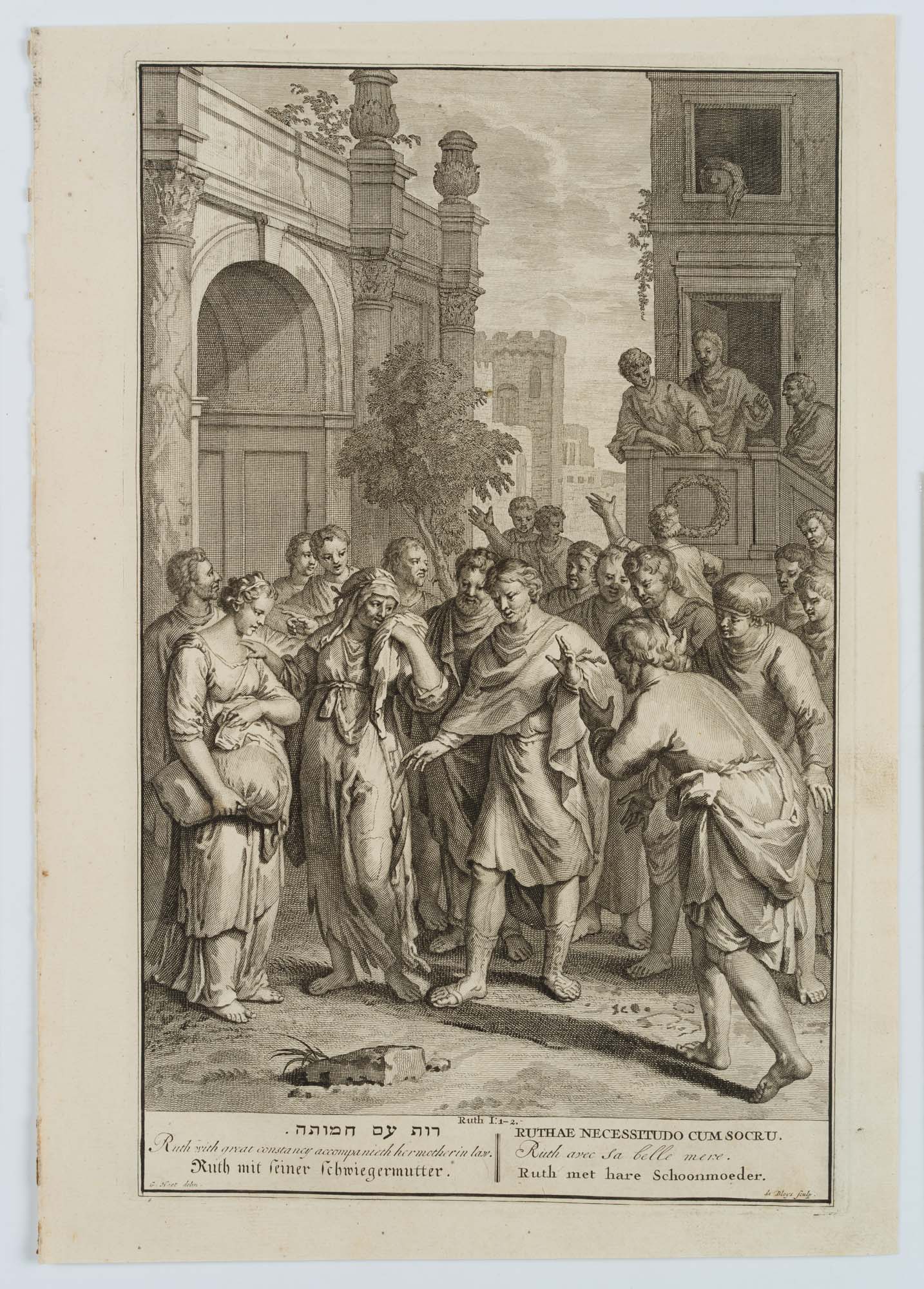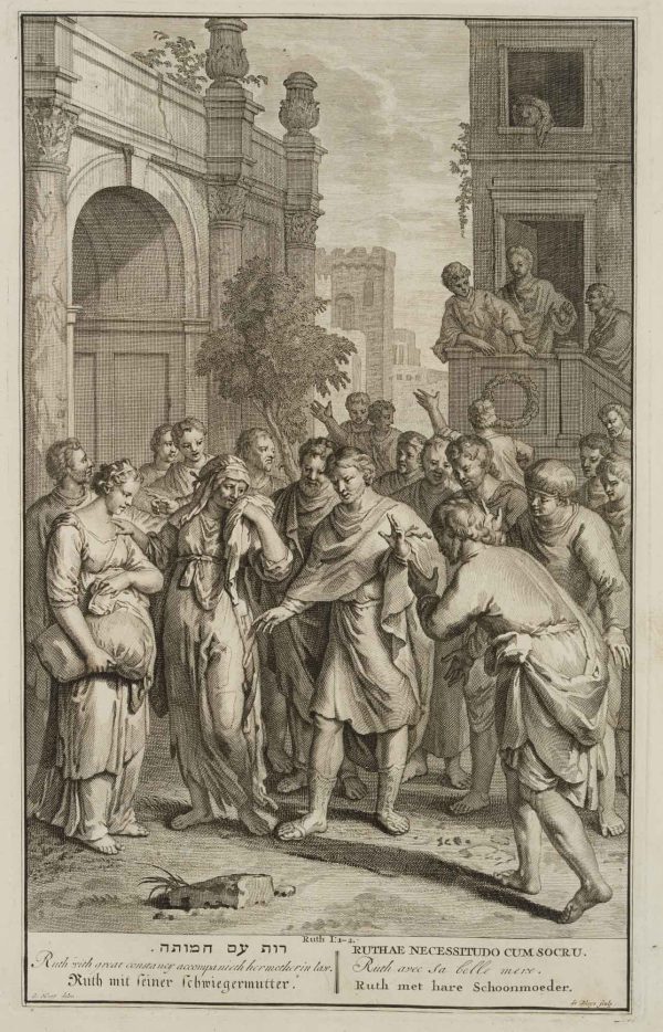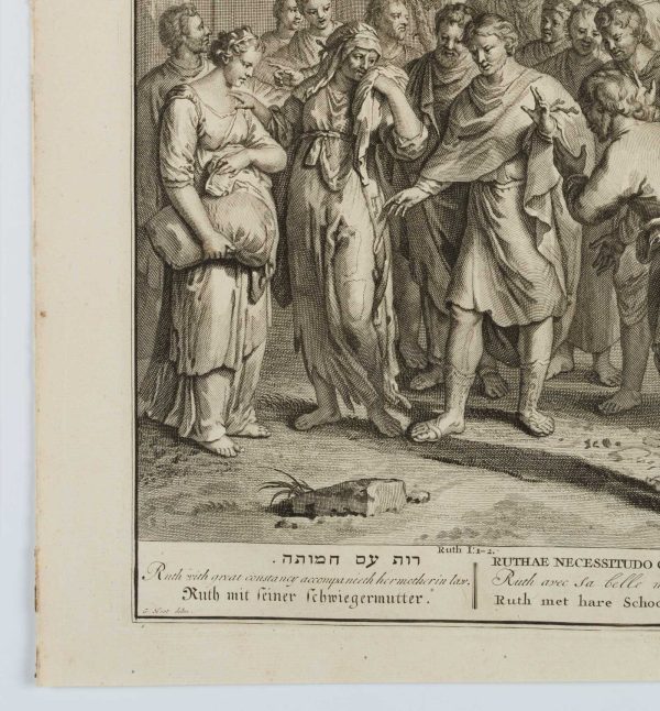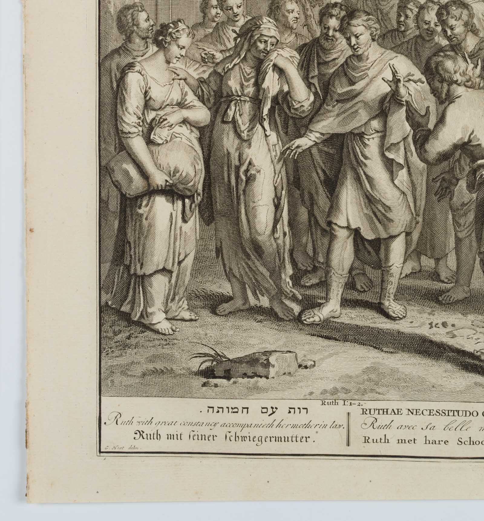 - Description: At the lower margin with reference to the biblical text: “Ruth I. 1-2” and the title in Hebrew, English, German, Latin, French and Dutch, signed below.