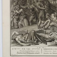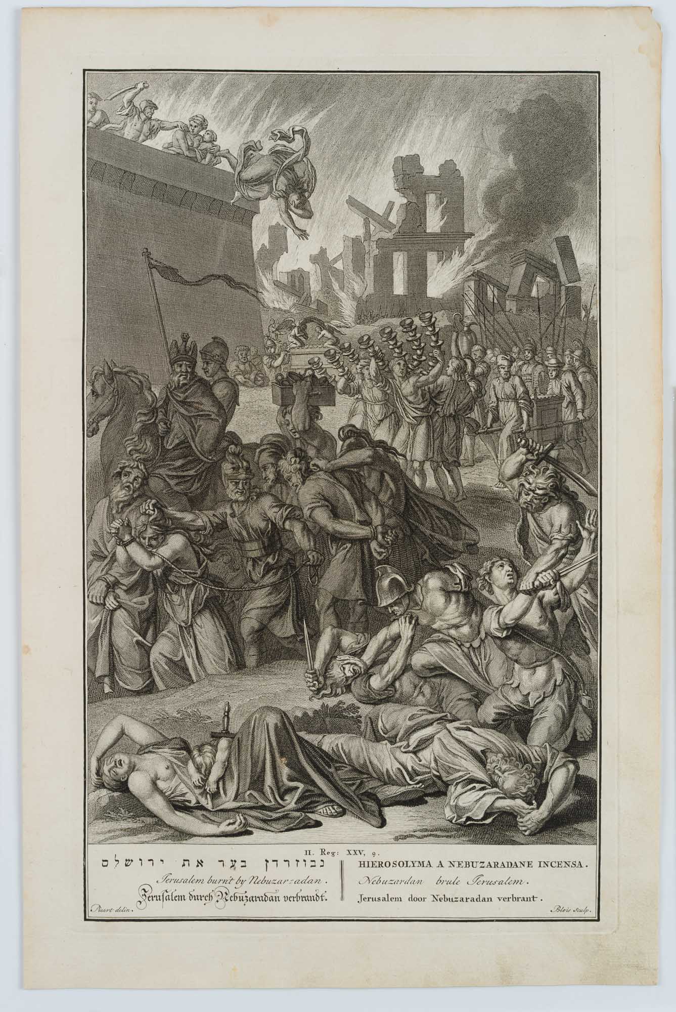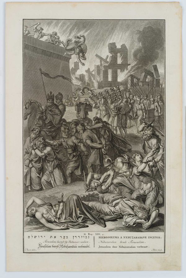 - Description: At the lower margin with reference to the Bible text: “II. Reg: XXV, 9” and the title in Hebrew, English, German, Latin, French and Dutch, signed below. On the inside of the sheet sheet the Bible text, ending with a copper vignette on the reverse. Sheet sheet from: ‘Hoet, Gerard. Tafereelen der heiligen geschiedenissen van het oude en nieuwe testament en der andere boeken gevoegt by de heilige schrift’.