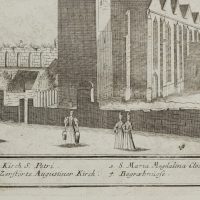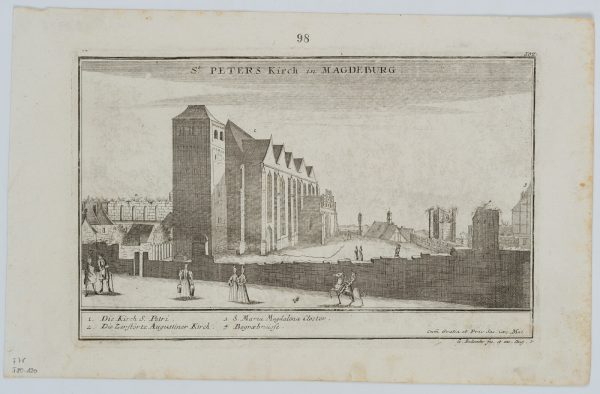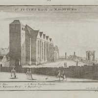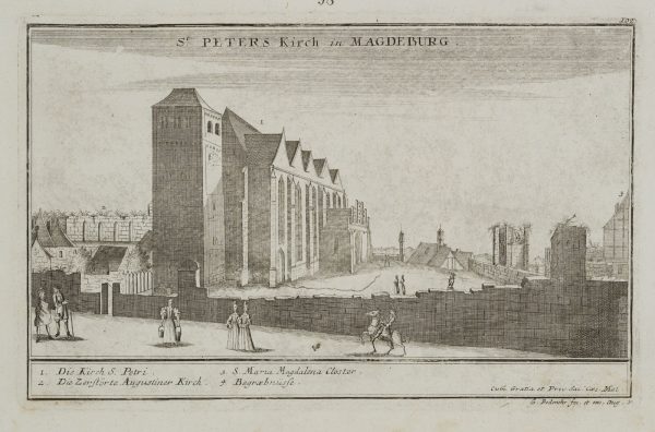 - Description: Caspar Merian(1627 Frankfurt am Main – 1686 Waltha Castle, West Frisia), S’ Peters Kirch in Magdeburg, Sankt Petri, city view, c. 1650, Etching, In the background the partly destroyed church buildings, in the foreground and middle ground horsemen and various passers-by looking at the ruins. Numerous inscriptions.