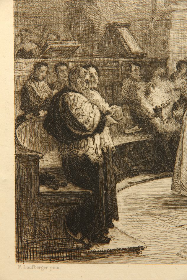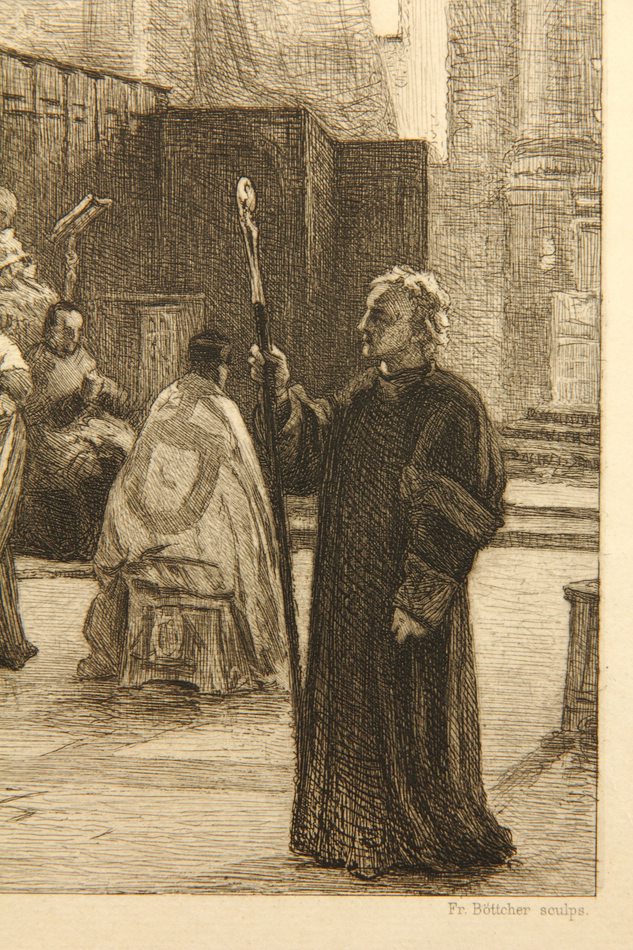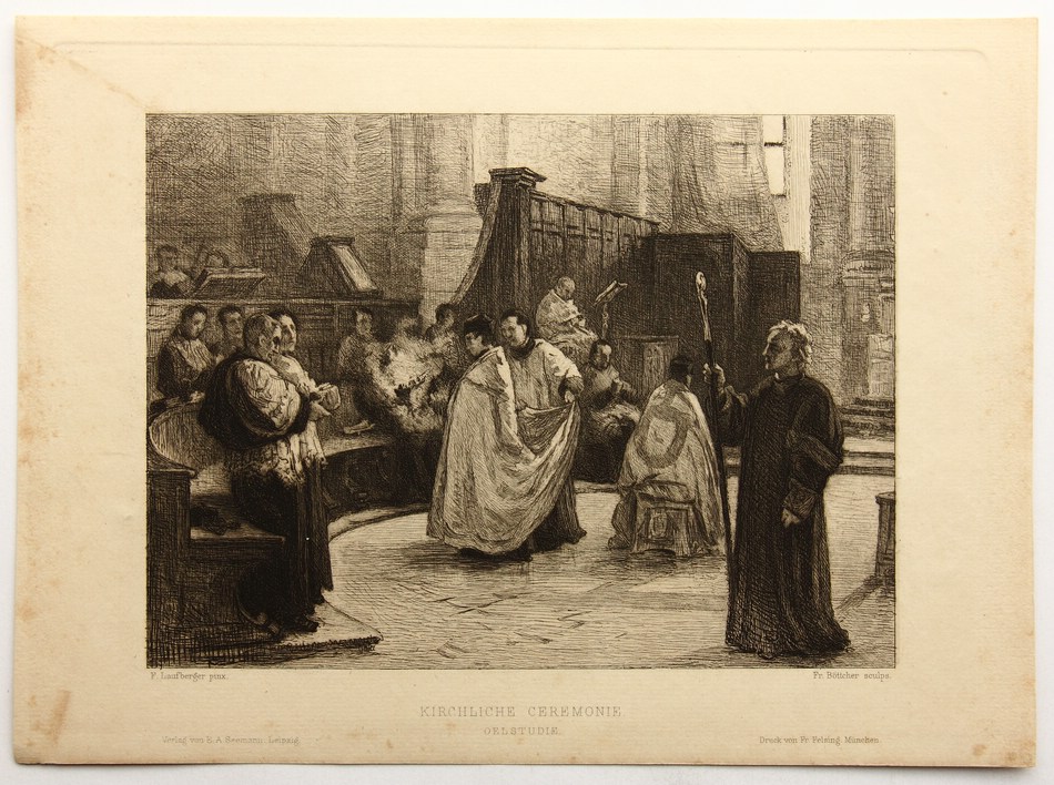 - Inscription: Signed and inscribed in the printing plate below the image: “F. Laufberger pinx. | Fr. Böttcher sculps. | Ecclesiastical Ceremony Oil Study | Publisher by E.A. Seemann. Leipzig | printed by Fr. Munich”.