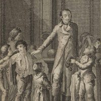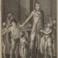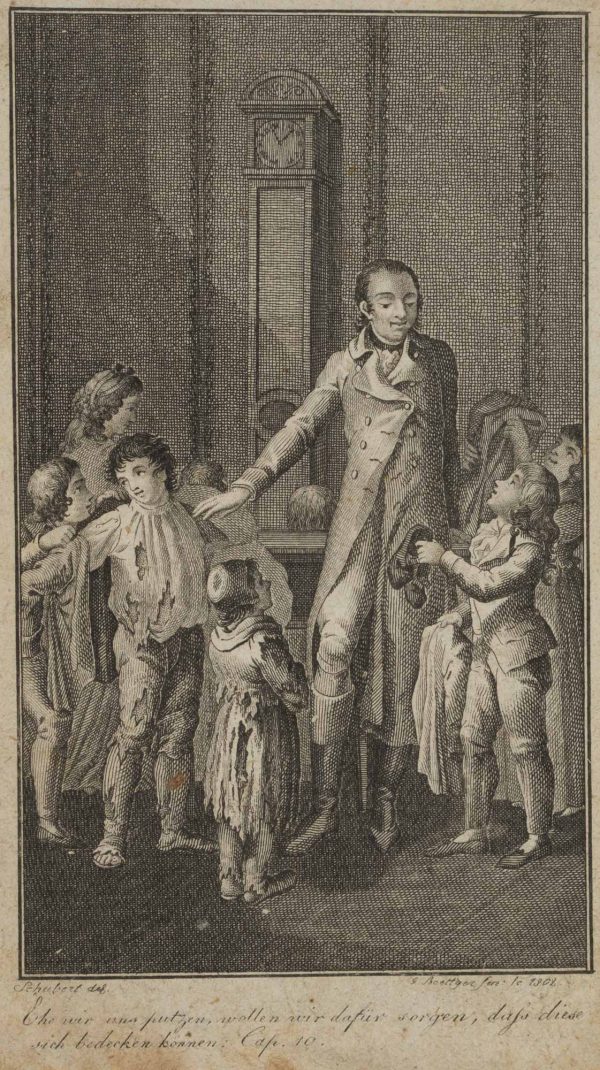 - Beschreibung: Illustriert eine Szene aus der Kurzgeschichte “Das schöne Halstuch”. Zeigt einen Schulmeister, der lehrende Worte an eine Gruppe armer und wohlhabend gekleideter Kinder richtet.