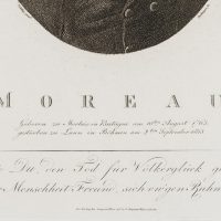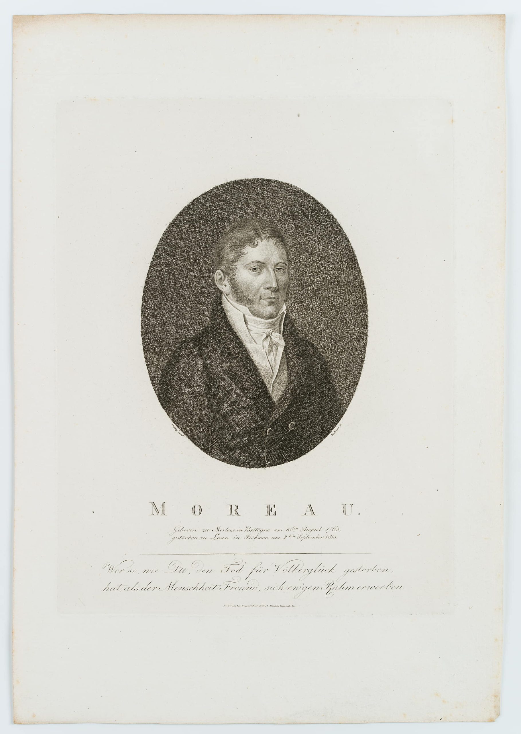 - Bezeichnung: Mittig im Druck signiert: “Dähling pinxt | Bollinger sc.”. Unten mittig im Druck bezeichnet: “Moreau / Geboren zu Morlaix in Bretagne am 10ten August 1763, / gestorben zu Laun in Böhmen am 2ten September 1813.”. Unten mittig weitere Beschriftungen: “Wer so, wie Du, den Tod für Völkerglück gestorben, hat, als der Menschheit Freund, sich ew’gen erworben.”. Unten mittig zusätzliche Beschriftung: “Im Verlag bei Gaspare Weiss & Co. u. b. Baptista Weiss in Berlin”.