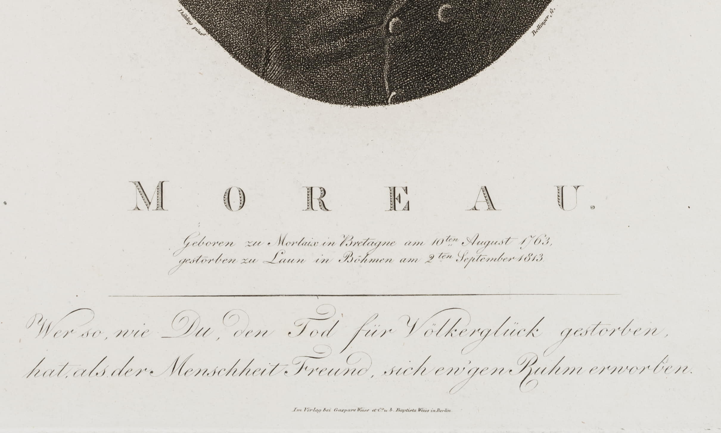 - Inscription: At the center signed in the printing plate: “Dähling pinxt | Bollinger sc.”. Lower middle inscribed in the printing plate: “Moreau / Geboren zu Morlaix in Bretagne am 10ten August 1763, / gestorben zu Laun in Böhmen am 2ten September 1813.”. Lower middle further inscription: “Wer so, wie Du, den Tod für Völkerglück gestorben, hat, als der Menschheit Freund, sich ew’gen erworben.”. Lower middle additional inscription: “Im Verlag bei Gaspare Weiss & Co. u. b. Baptista Weiss in Berlin”.