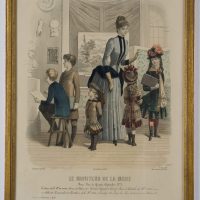 The fashion is modelled in the Parisian fashion publication ‘Le Moniteur’ in naturalistic living rooms or outdoors by women depicting everyday activities of the bourgeoisie. The chic dresses are complemented by hats and hairstyles. At the bottom are the names and addresses of the fashion houses that produced or sold the garments and accessories depicted.
