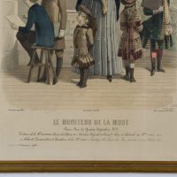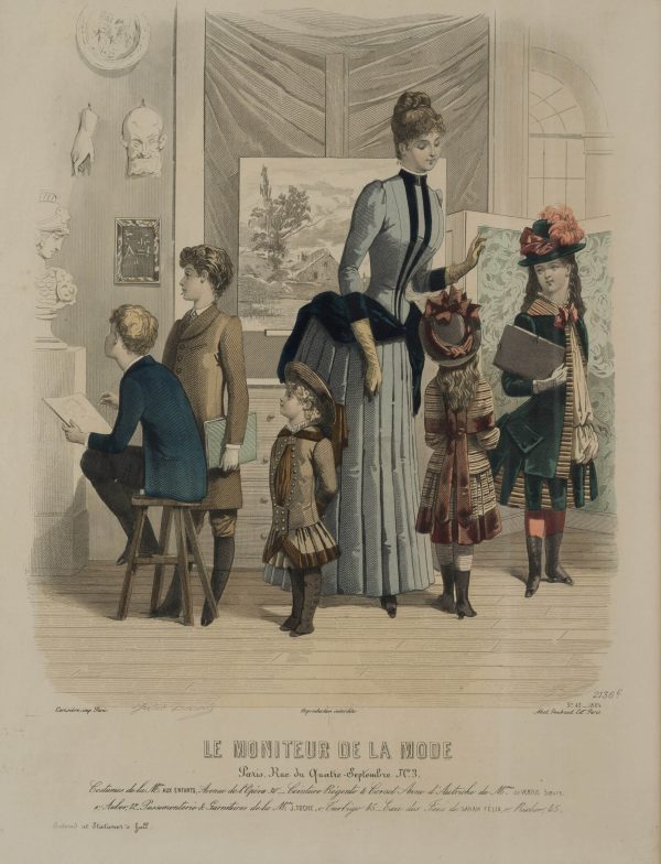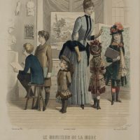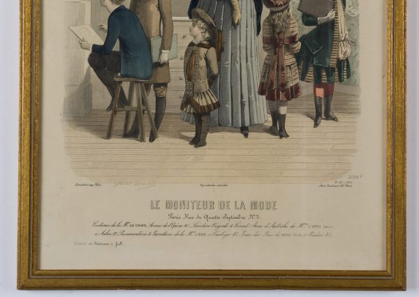 Die Mode wird in der Pariser Modepublikation ‘Le Moniteur’ in naturalistischen Wohnzimmern oder im Freien von Frauen modelliert, die alltägliche Aktivitäten der Bourgeoisie darstellen. Die schicken Kleider werden durch Hüte und Frisuren ergänzt. Am unteren Rand stehen die Namen und Adressen der Modehäuser, die die abgebildeten Kleidungsstücke und Accessoires produzierten oder verkauften.