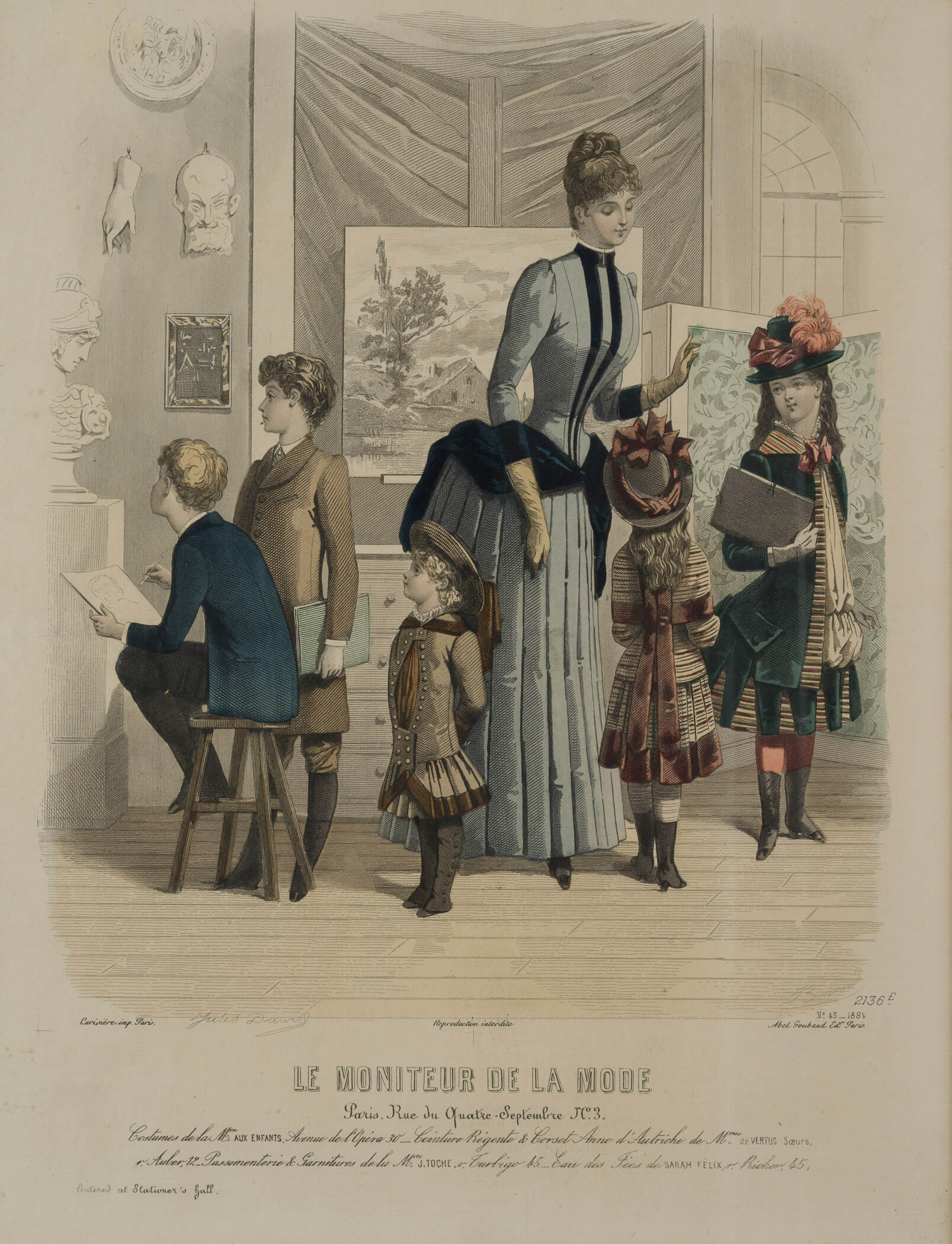 - Inscription: At the lower part signed: “Jules David | Bonnard”. Lower right numbered: “N. 43 | 2136E”. At the lower part further inscription: “Le Moniteur de la Mode”.