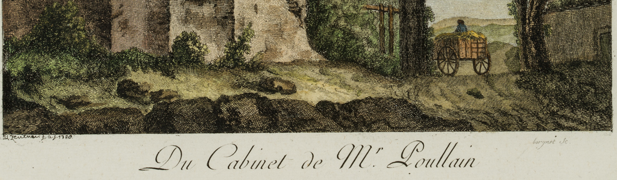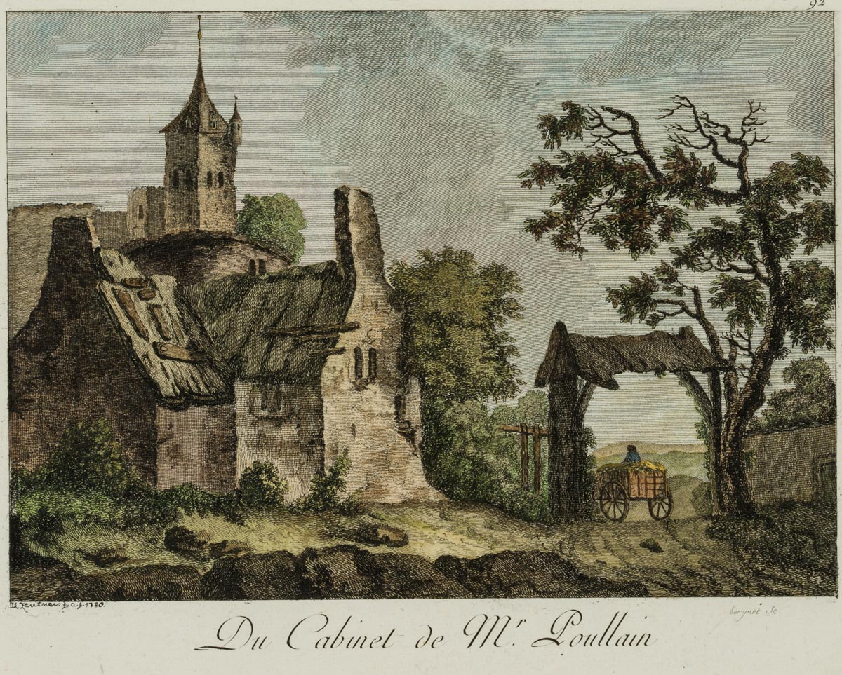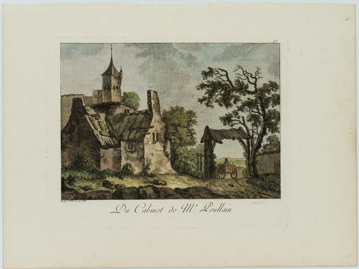 bezeichnet “J.L. Zentner f.a.f. 1780”, “borgnet sculp.”, benannt “Du Cabinet de Mr. Poullain”. Ansicht eines Dorfes, das Haus im Vordergrund scheint verfallen zu sein, im Hintergrund ist der Turm einer Festung zu erkennen. Durch ein Tor am rechten Bildrand fährt soeben ein kleines Gespann mit Kutscher.
