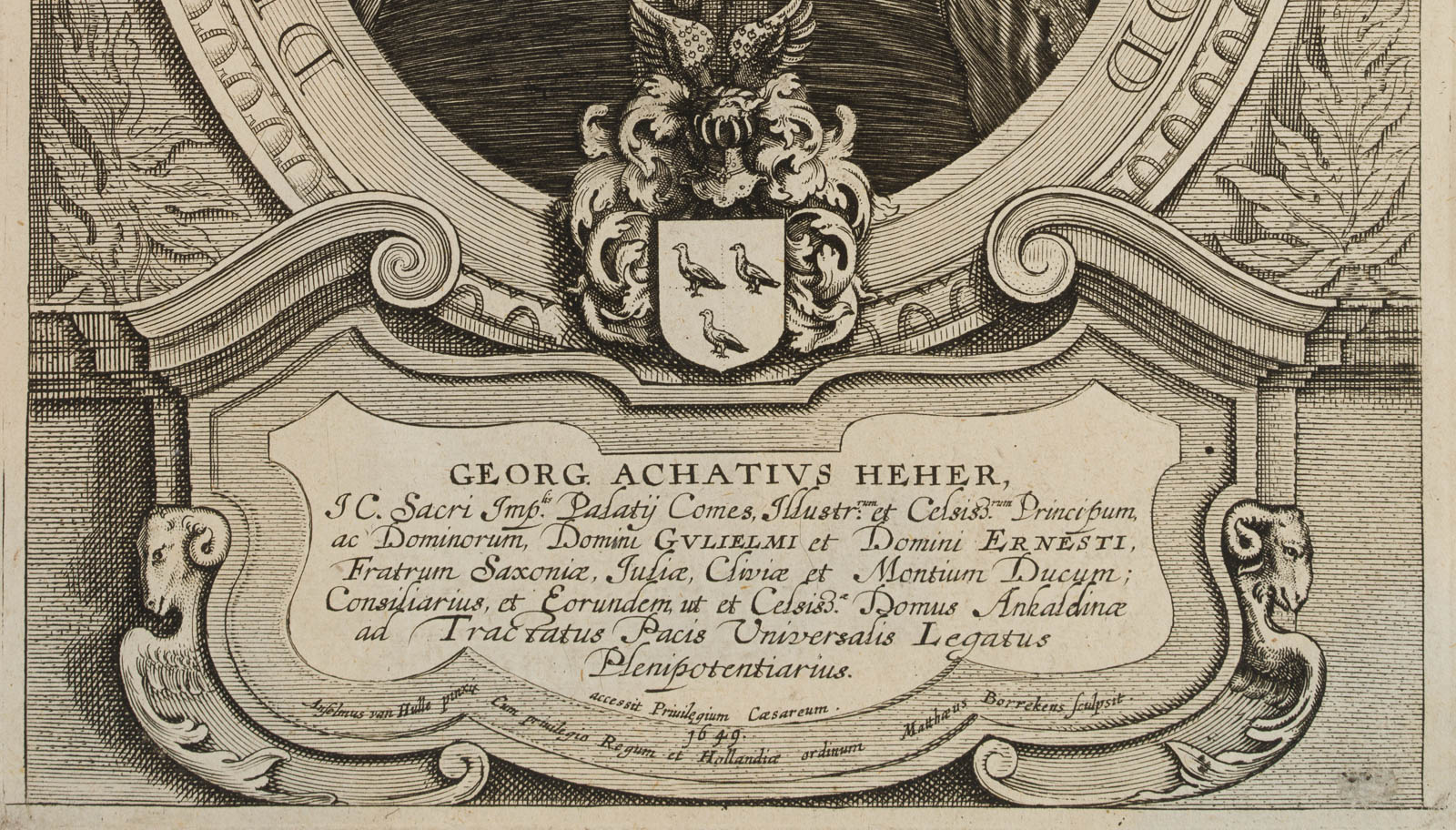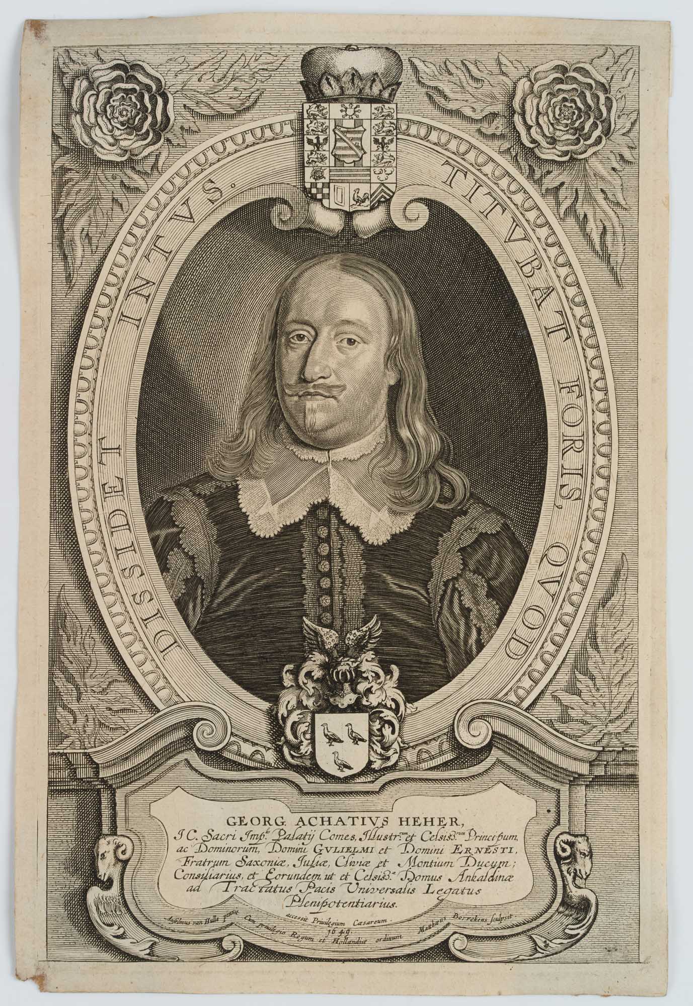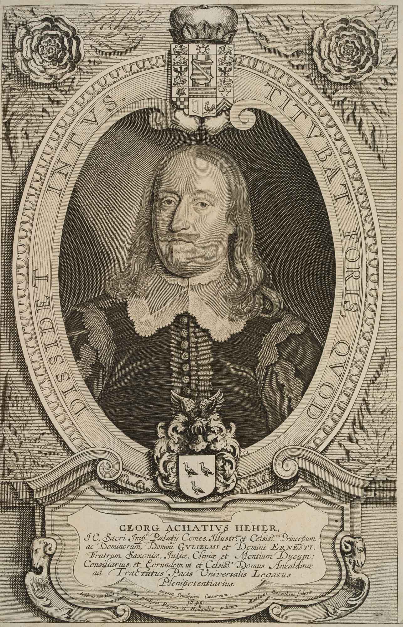 Mattheus Borrekens (um 1615 Antwerpen – 1670 ebd.) nach Anselmus von Hulle (1601 Gent – nach 1674 ), Bildnis des Georg Achatz Heher, auch Achatius (1601 Nürnberg – 1667 Rudolstadt), dt. Jurist, Diplomat und Kanzler, 1649, Kupferstich