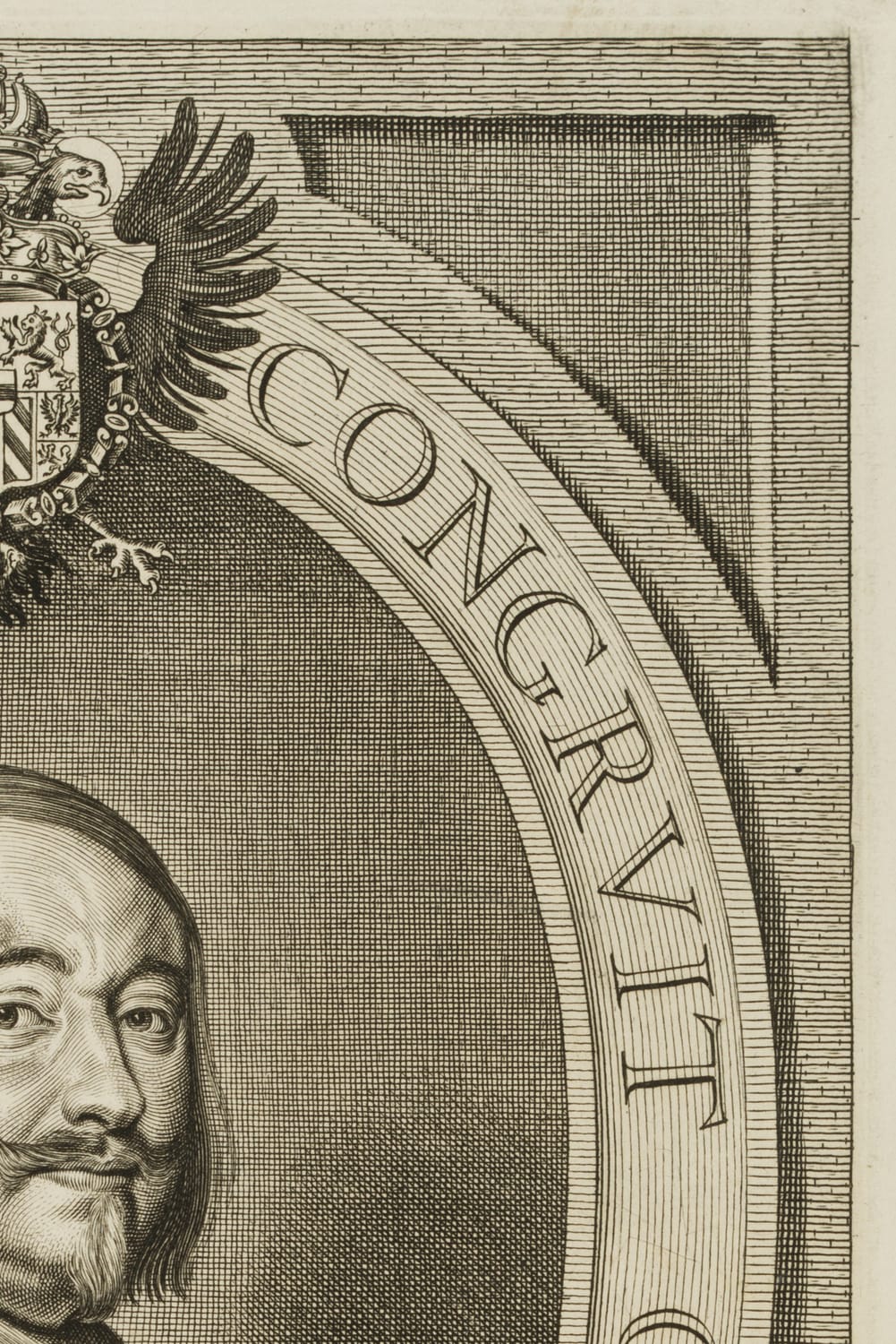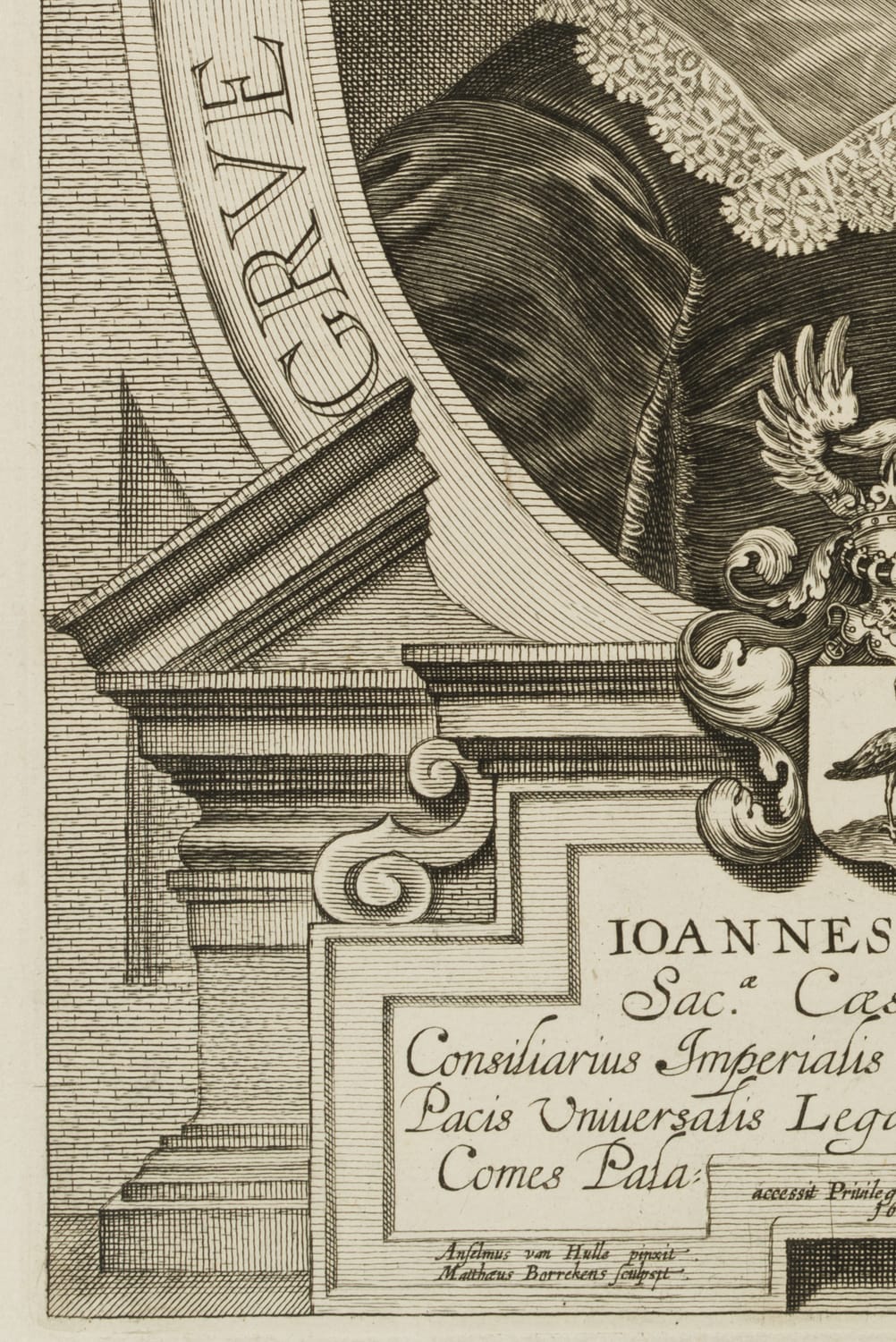 - Inscription: At the lower part signed in the printing plate: “Anselmus van Hulle pinxit. / Mattheus Borrekens sculpsit.”. Lower middle inscribed in the printing plate: “IOANNES DE CRANES Sac.ae Caes.ae Ma.tis Consiliarius Imperialis Aulicus et ad Tractatus Pacis Universalis Legatus Plenipotentiarius, Comes Pala= tinus etc.”. Lower right numbered in the printing plate: “42”. Lower middle dated: “accessit Privilegium Caesareum. 1648”. At the center further inscription: “CONGRVIT CON=/GRVE CONGRVERE”. Lower right additional inscription: “Cum privilegio Regum et Hollandiae ordinum.”. General information: written in sepia ink: 90.