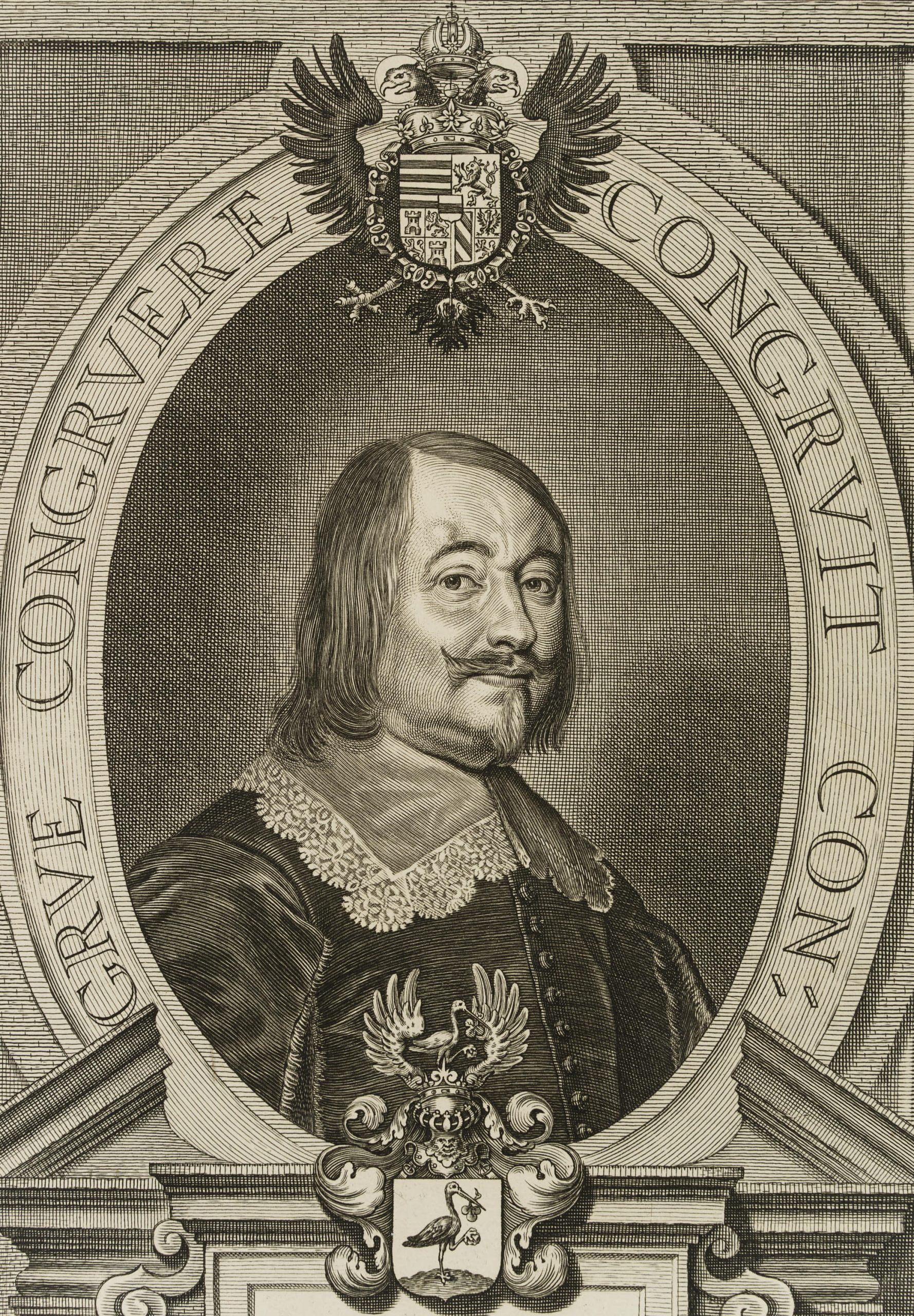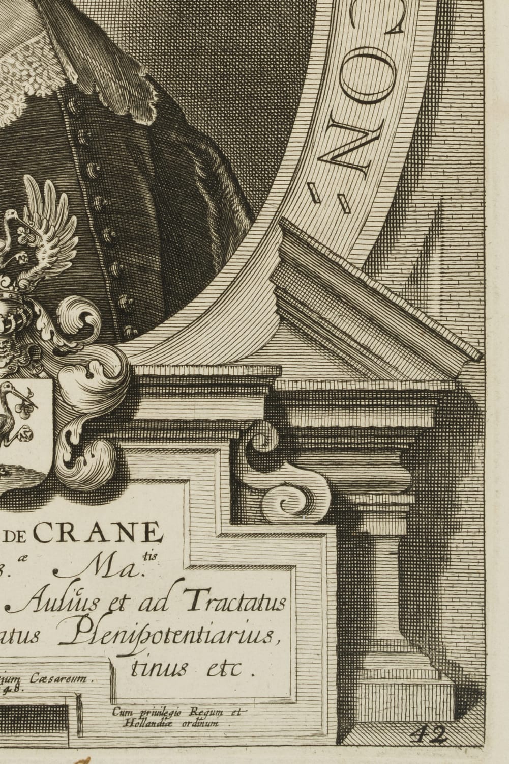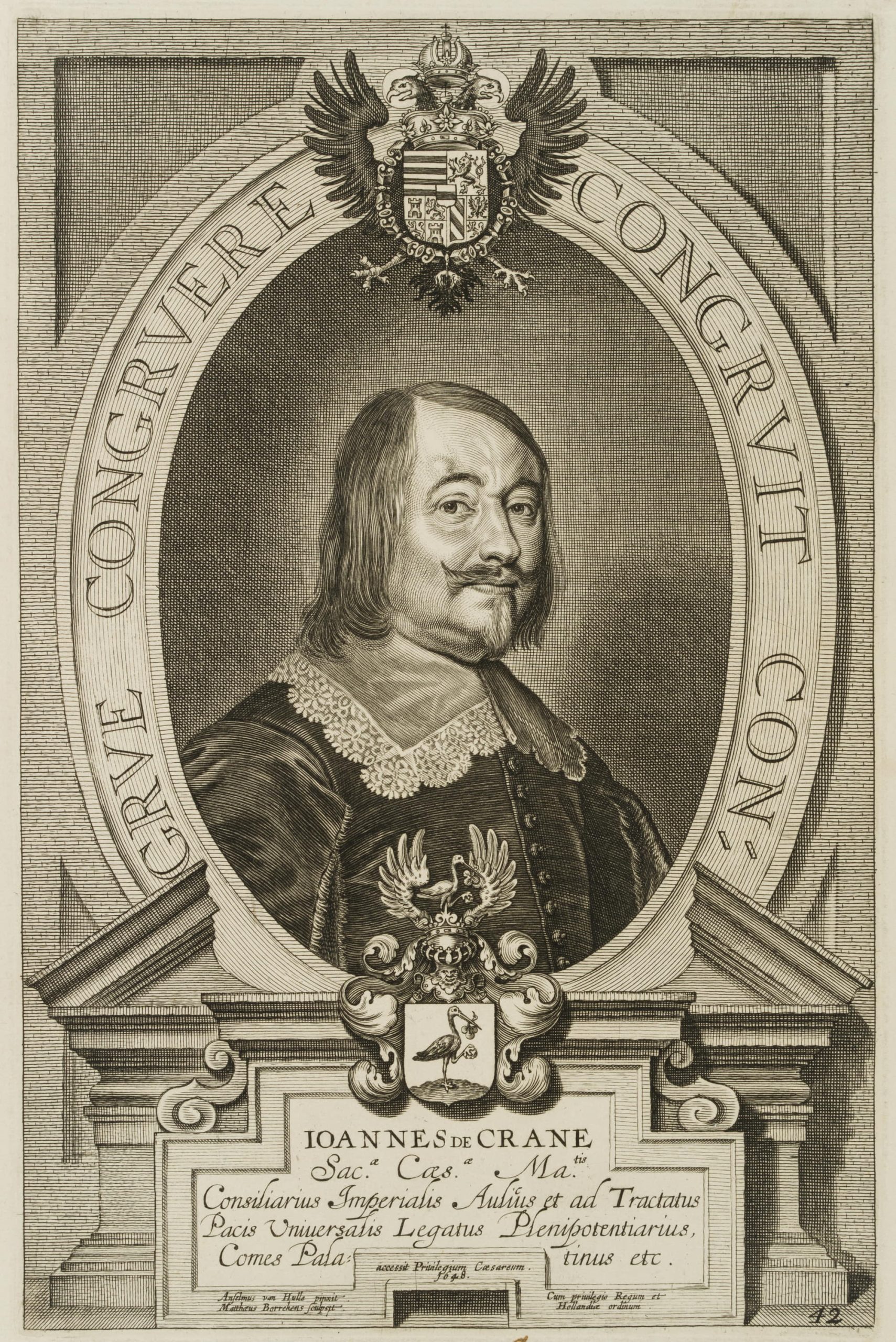 - Description: Johann von Crane (1595-1673) was the Imperial High Councillor of the Holy Roman Empire from 1633. He was sent by the city of Cologne as a negotiator for the Peace of Münster. The decorative frame shows his official dignity under the emperor by the double-headed eagle, then his coat of arms with the image of a crane onomatopoeically designed after his surname of the official who was only ennobled in 1652.