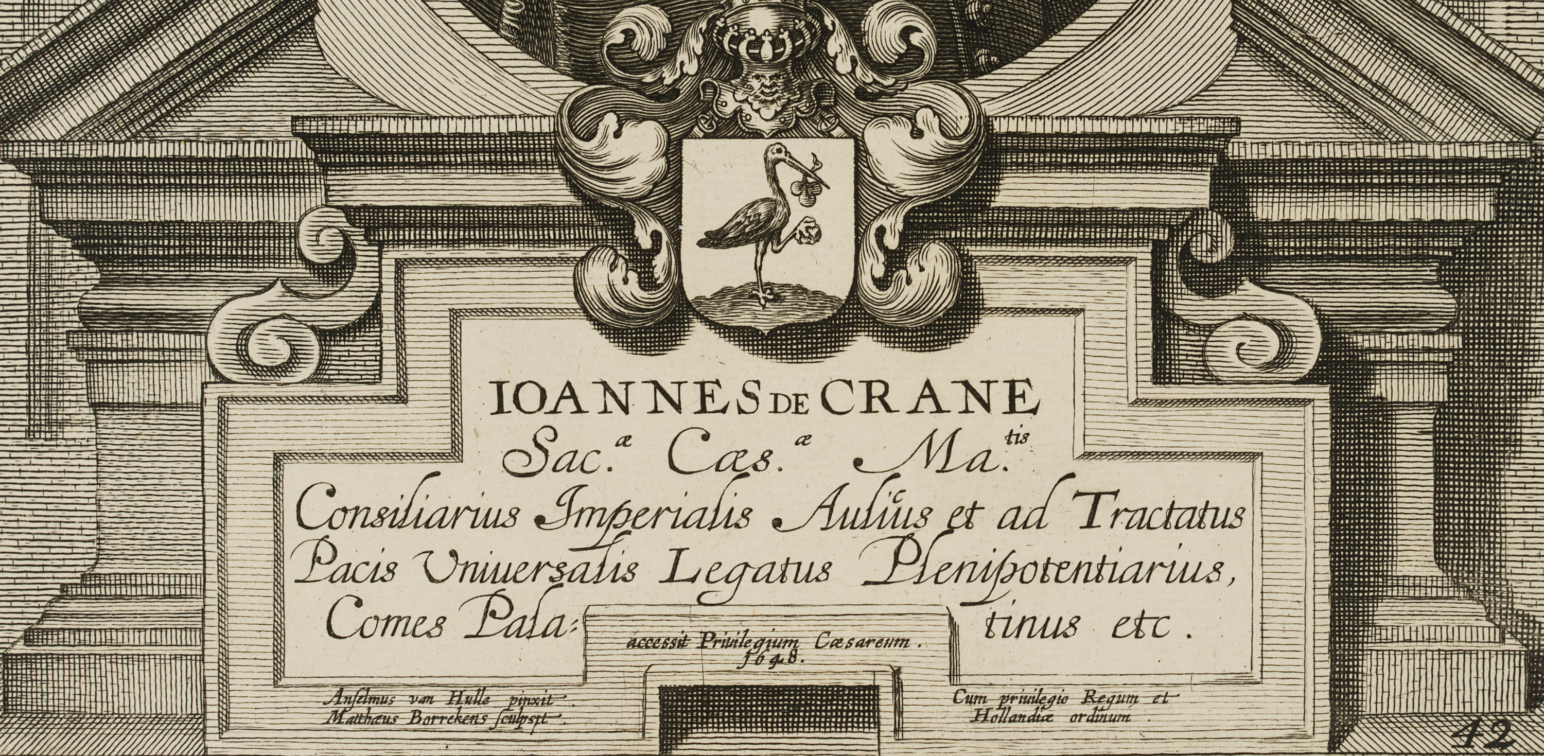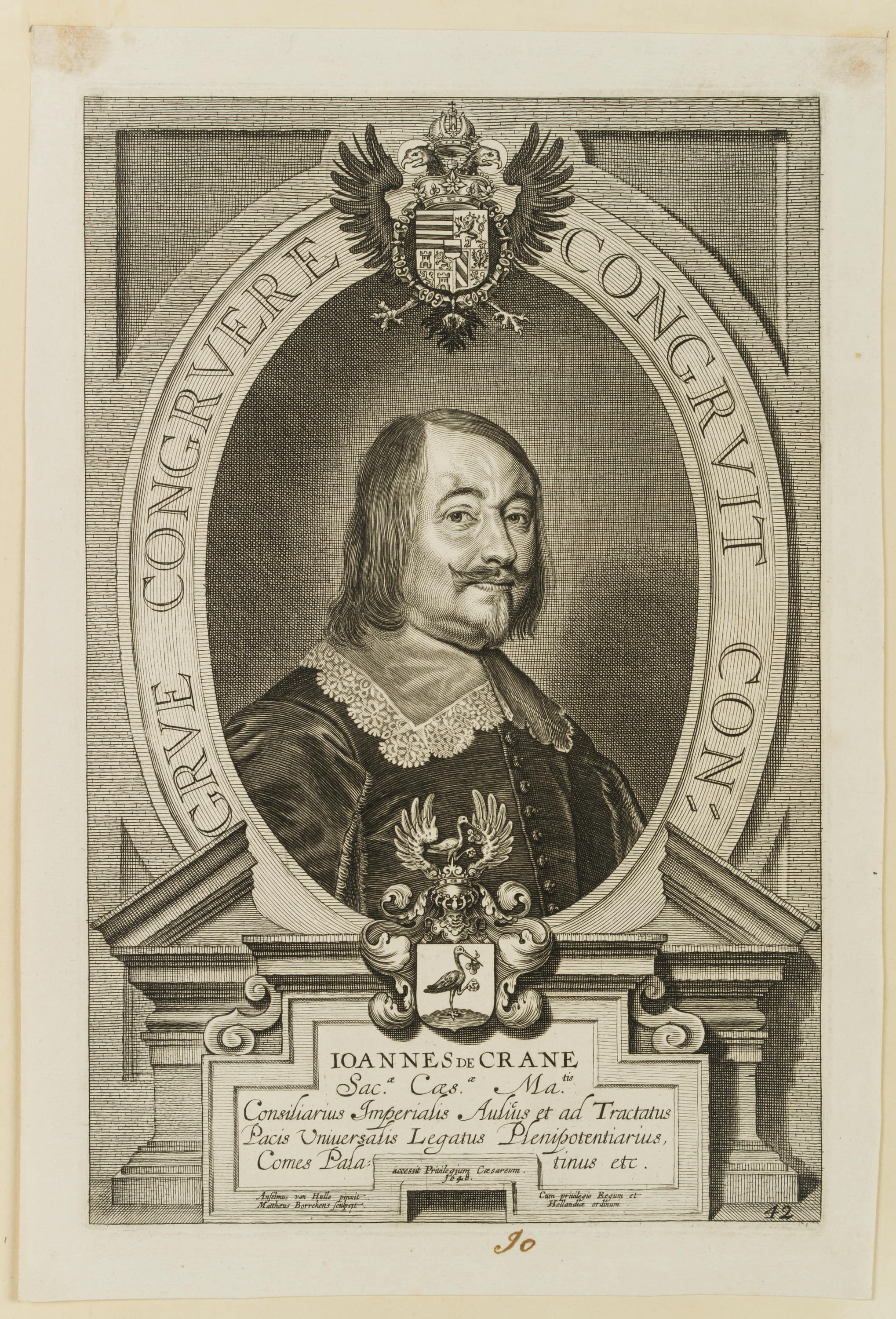 - Beschreibung: Johann von Crane (1595-1673) war ab 1633 Reichshofrat des Heiligen Römischen Reiches. Zum Frieden von Münster wurde er von der Stadt Köln als Unterhändler entsandt. Der Schmuckrahmen zeigt einmal seine Amtswürde unter dem Kaiser durch den doppelköpfigen Adler an, dann sein Wappen mit dem Bild eines Kranichs lautmalerisch nach seinem Nachnamen entworfen des erst 1652 geadelten Beamten.