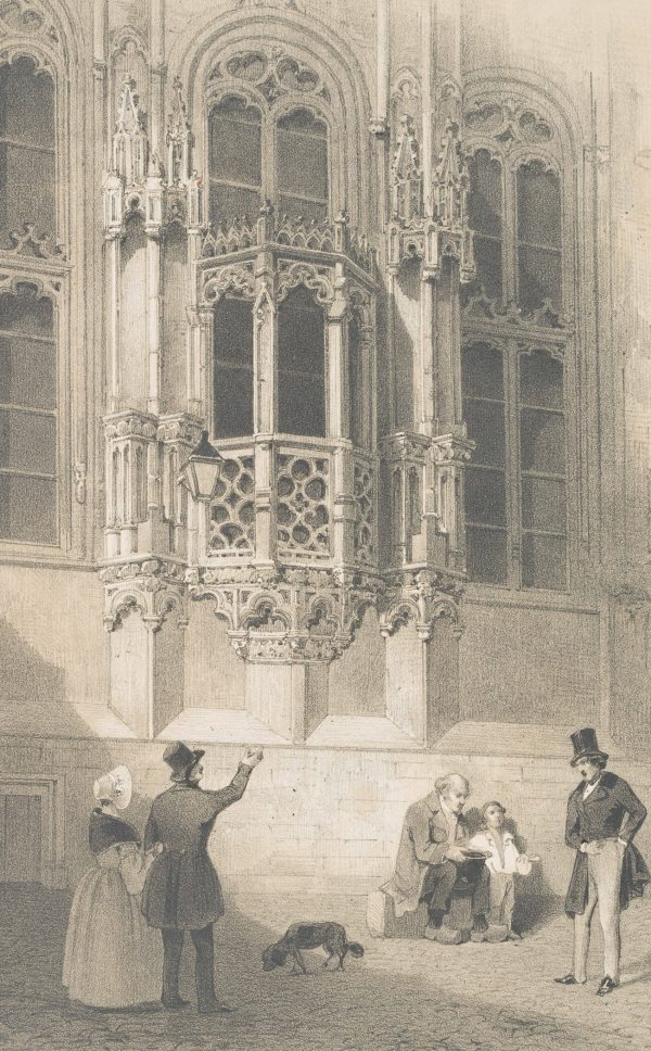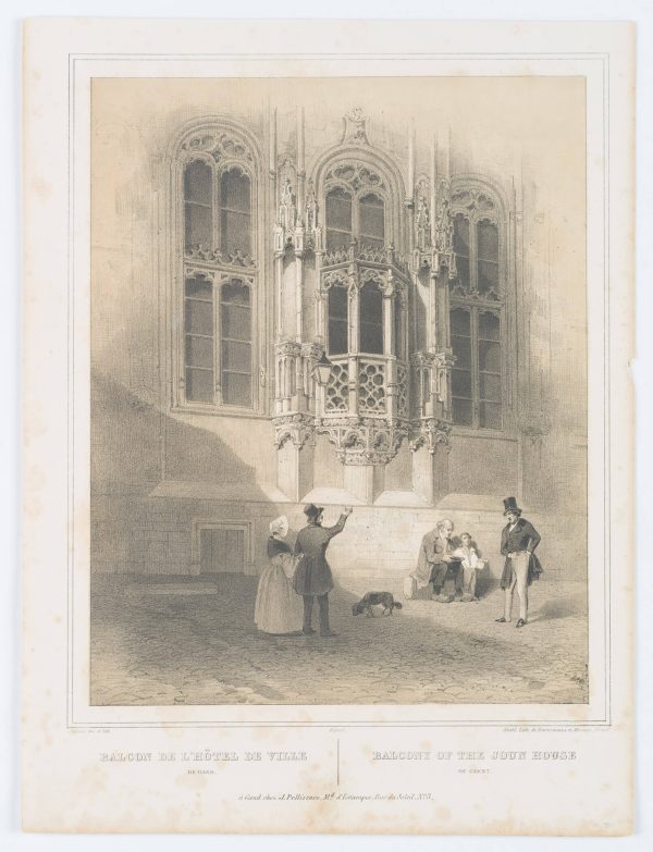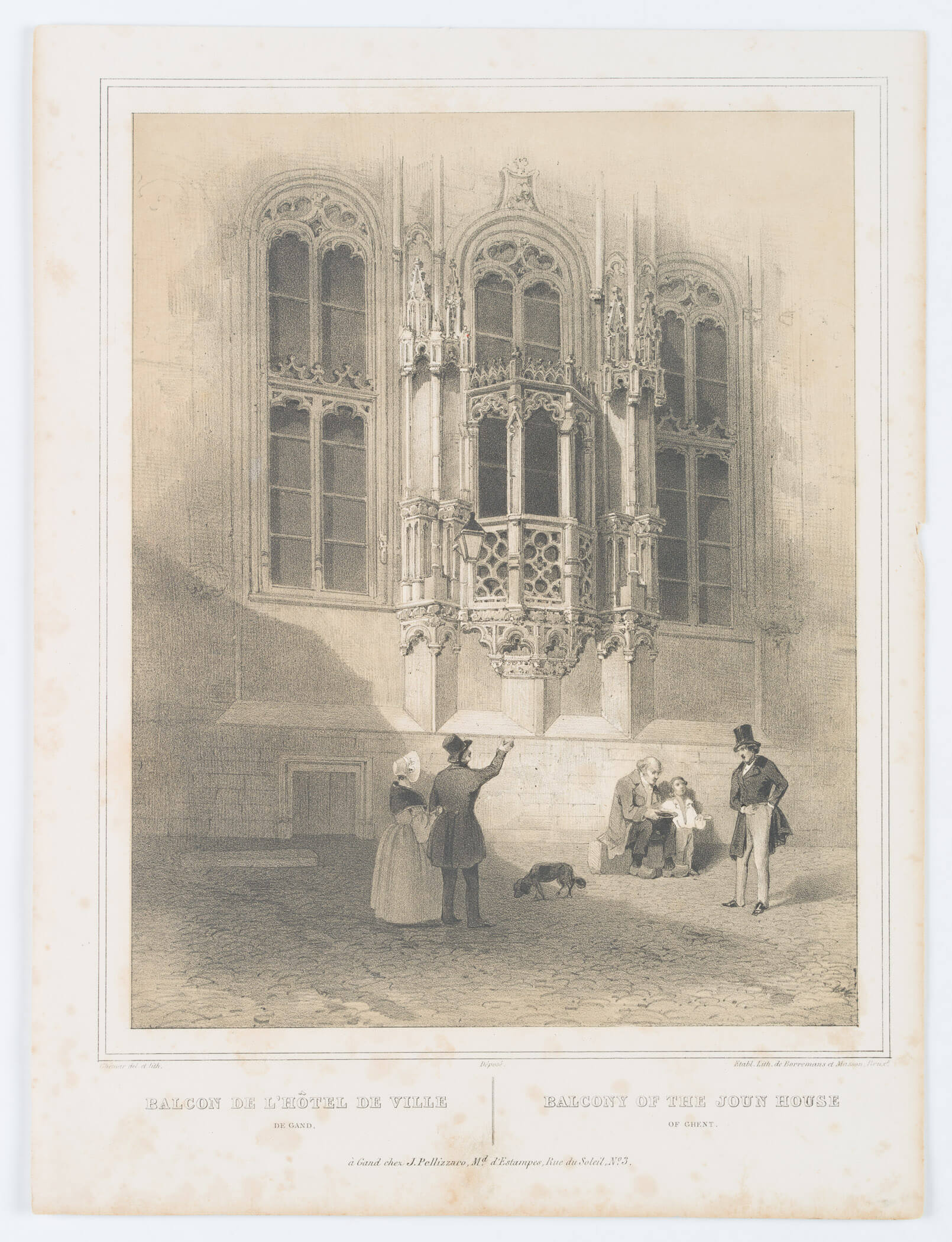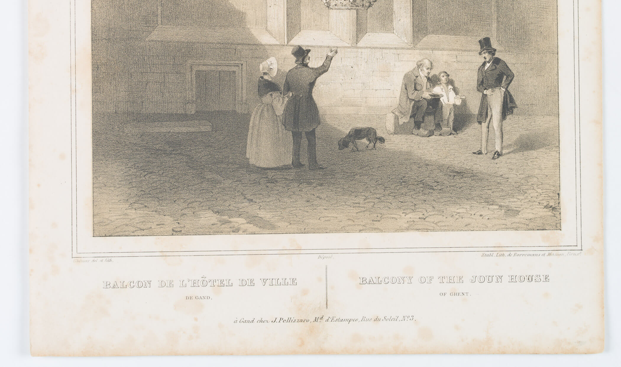 - Bezeichnung: Unten mittig im Druck signiert: “Chémar del et lith | Etabl. Lith. de Borremans et Masson, Bruxs.”. Unten mittig im Druck bezeichnet: “Balcon de l’Hôtel de ville | Balcony of the Joun House of Ghent”.