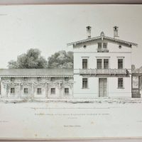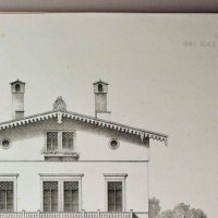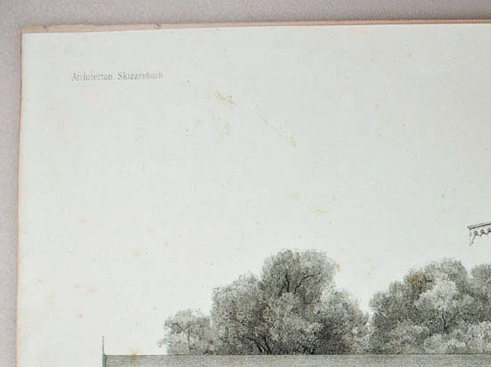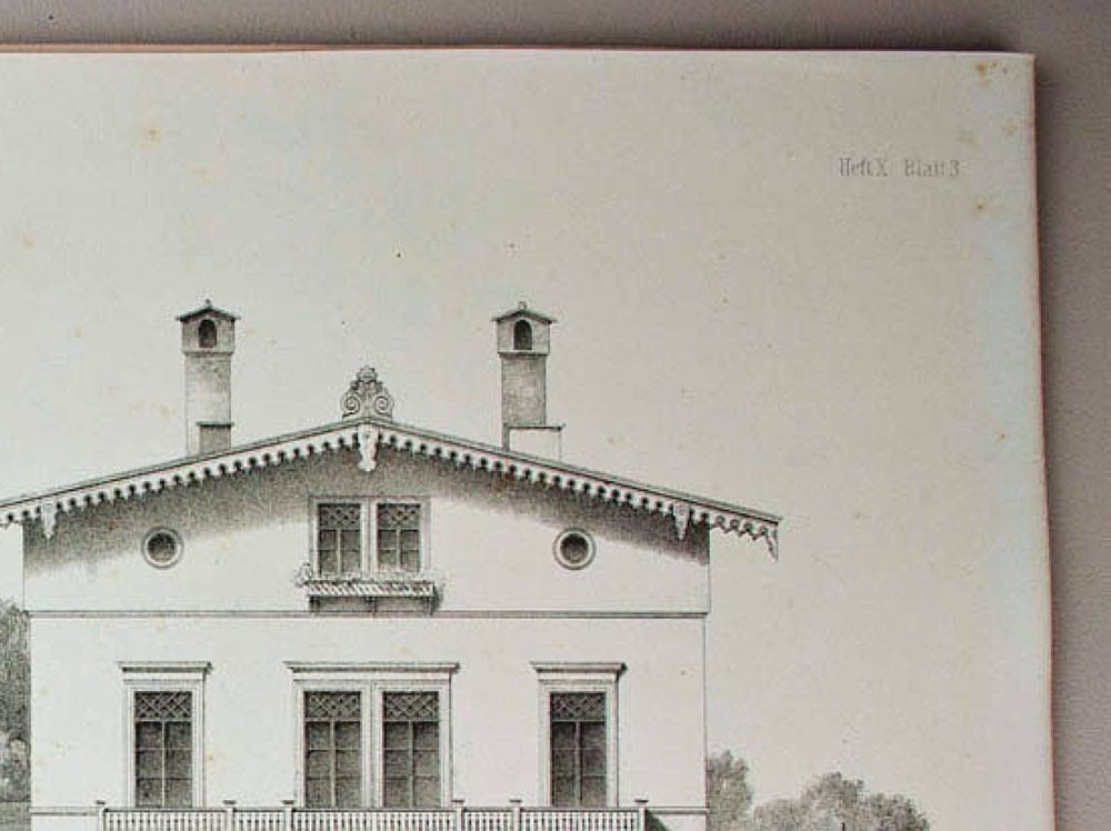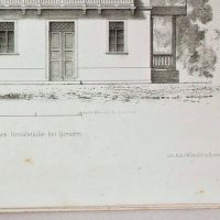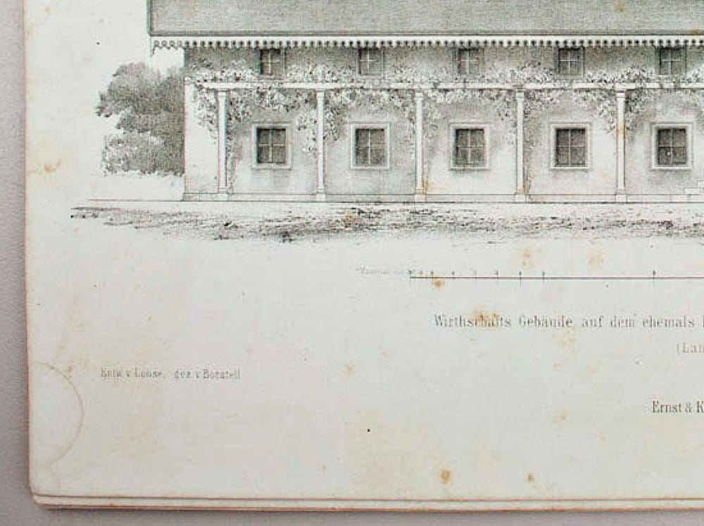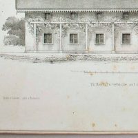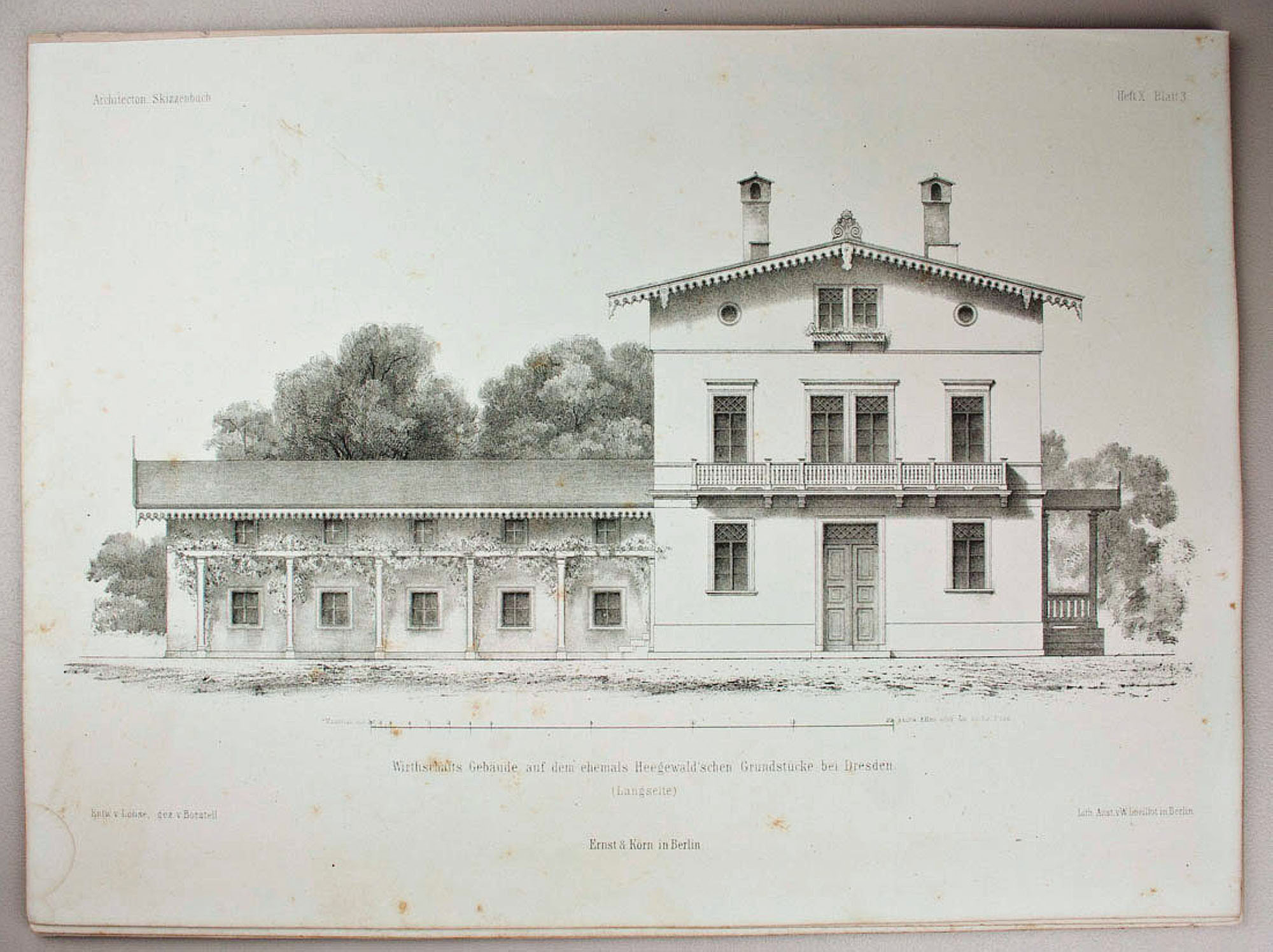 - Beschreibung: Wirthschaftsgebäude auf dem ehemals Heegewald-schen Grundstücke bei Dresden. Lithographie (1860-1866). Lithographie Anst. v. W. Loeillot in Berlin. Entw. V. Lohse, gez v. Borstell. Heft X. Blatt 3. Aus dem Architectonisches Skizzenbuch Verlag Ernst & Korn in Berlin. Es handelt sich hierbei um “La Tête de collection”, die Französische Ausgabe dieser zeitgenössischen Deutschen Architektur. Die Textseiten wurden übersetzt und gedruckt in Paris. Die erste Französische Ausgabe (Juli 1860) korrespondiert mit der Ausgabe 41 der Deutschen Ausgabe.