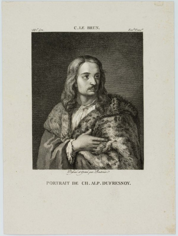 - Description: Inscribed above the image: ‘No.571 – C. Le Brun – Ecole Franç.se’; below: ‘Dessiné et Gravé par Boutrois’ and title. The depiction shows the French painter Charles Alphonse Dufresnoy (*1611 Paris – 1668 Villiers-Le-Bel). His impact on painting remained continuously very influential until the 19th century; after Le Brun.