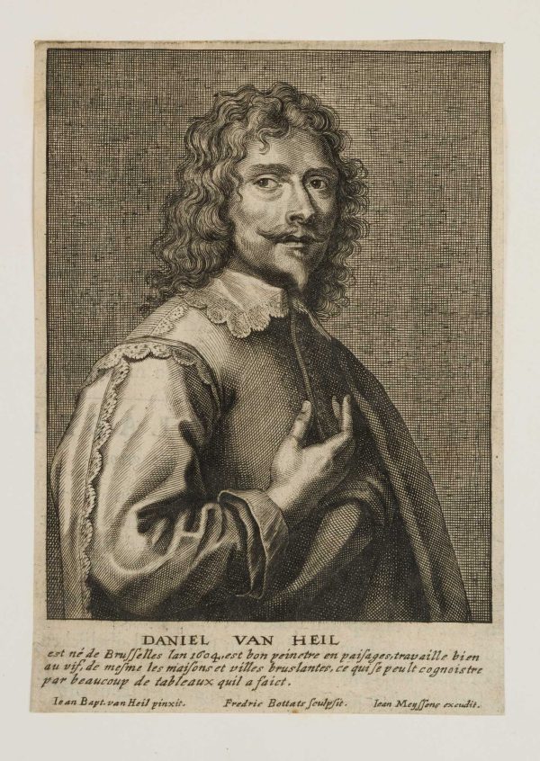 - Description: Portrait of the Flemish, Baroque landscape painter Daniel van Heil; depicted in a coat with a fine, white lace collar and curly hair. From the book “Het Gulden Cabinet” (1662) or “The Golden Cabinet of the Noble Liberal Art of Painting”. Titled below the image and with three lines of French: “est né de … / .. quil a faict.”; below with production details: “Iean Bapt. van Heil pinxit. / Fredric Bottats sculpsit. / Iean Meyssens excudit.”.