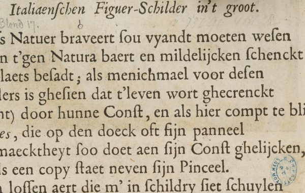 Verso mit niederländischer Textseite und Sammlerstempel “Collection D’Arenberg”, verzeichnet bei Lugt L.567.