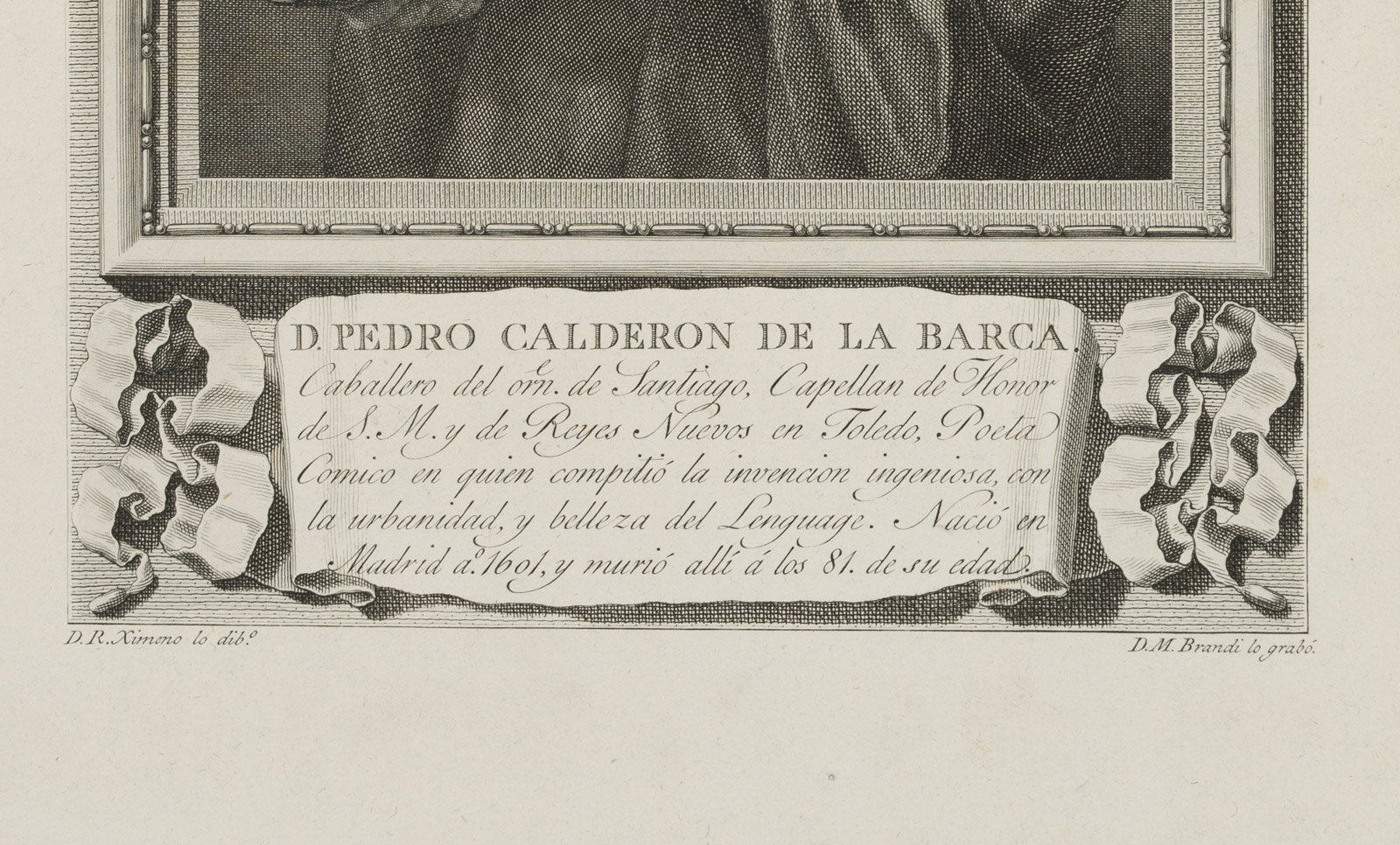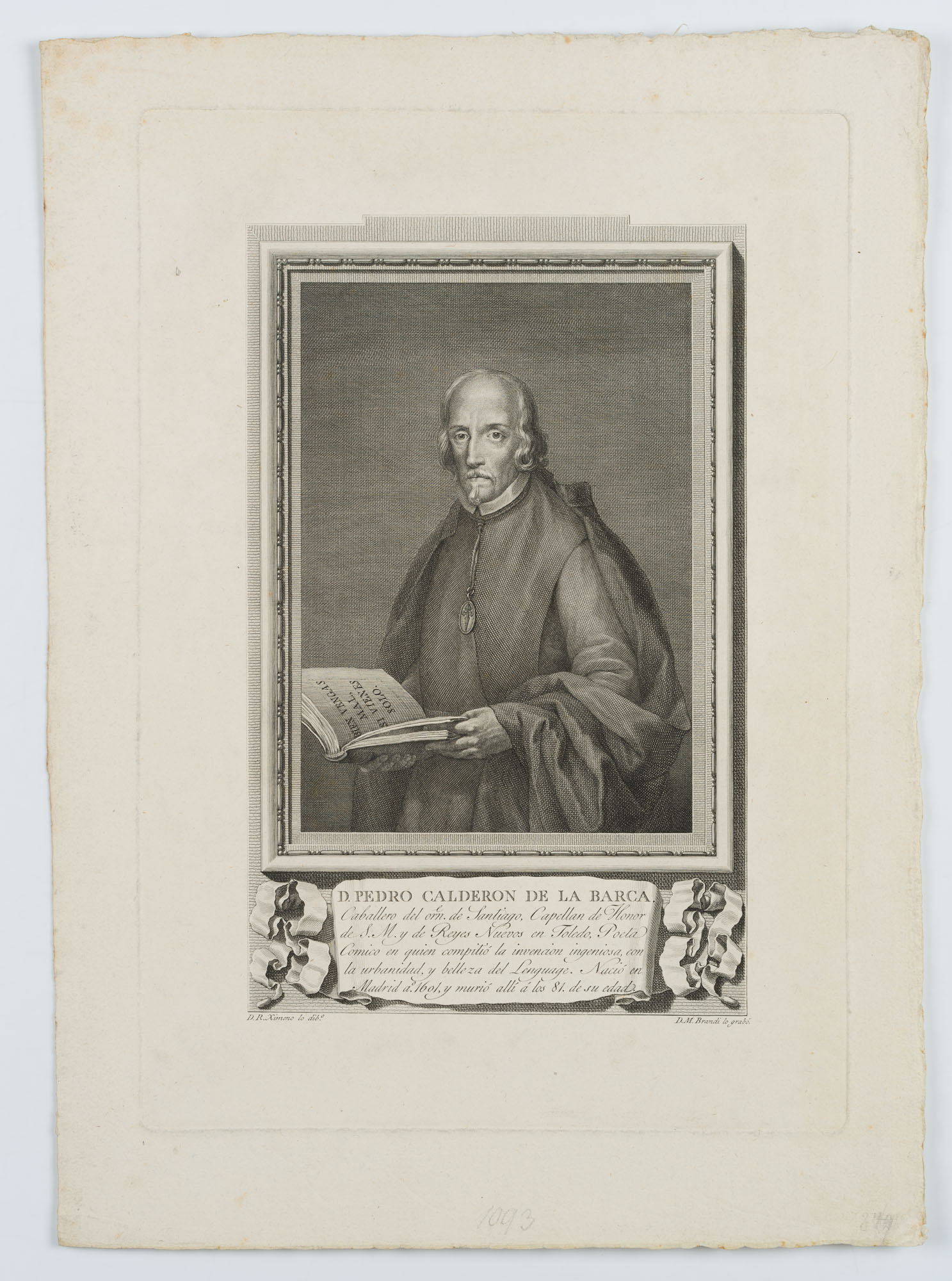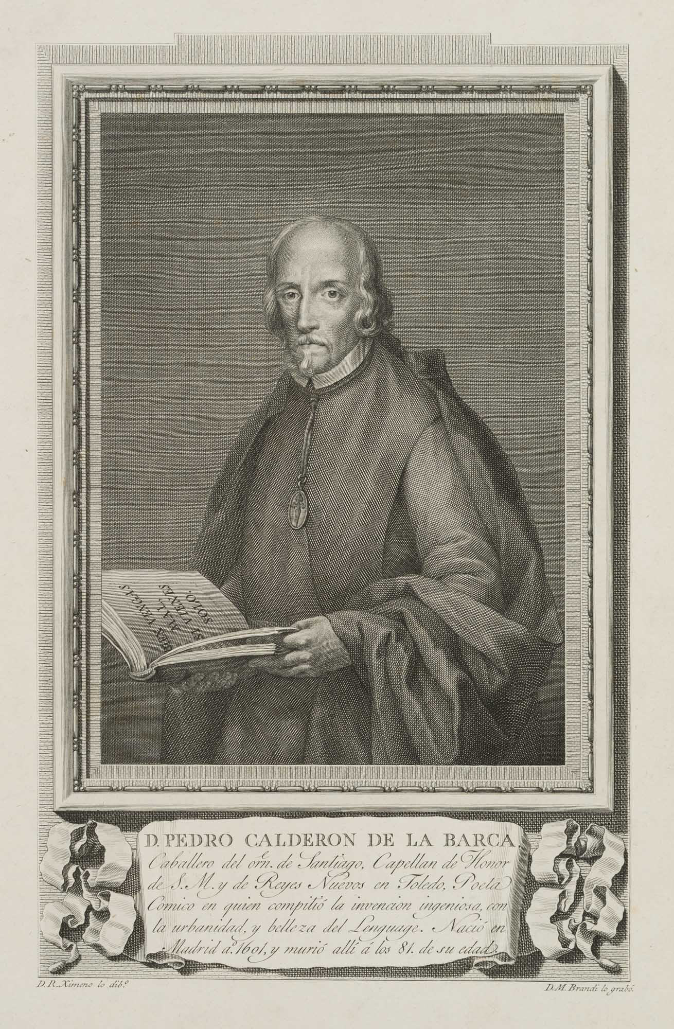 Mariano Brandi (1779 Valencia – 1817 Madrid) after Rafael Ximeno (1755 Valencia – 1825 Mexico City), Portrait of the Spanish poet and playwright Pedro Calderón de la Barca, half-figure in three-quarter profile with book in hand, 1791, Copper engraving