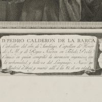 - Beschreibung: Das Werk Calderóns stellt den ersten Höhepunkt des spanischen Theaters dar. Im Vergleich mit dem volkstümlicheren und oft originelleren Lope de Vega (Vega Carpio) verkörpert er die strengere Kunst, gepaart mit tiefgründiger Philosophie. Von Calderón sind ca. 120 Dramen (sogenannte Comedias) und 80 Fronleichnamsspiele erhalten. Zudem schrieb er etliche Entremés, Libretti für Opern und Zarzuelas. Im geöffneten Buch, das Calderon in den Händen hält, ist zu lesen: “Bien Vengas Mal, Si Vienes Solo.”. In der Kartusche unten mit dem Namen des Dargestellten und dessen Lebensdaten auf Spanisch beschriftet.