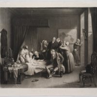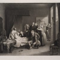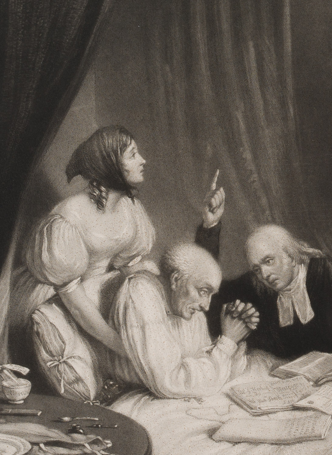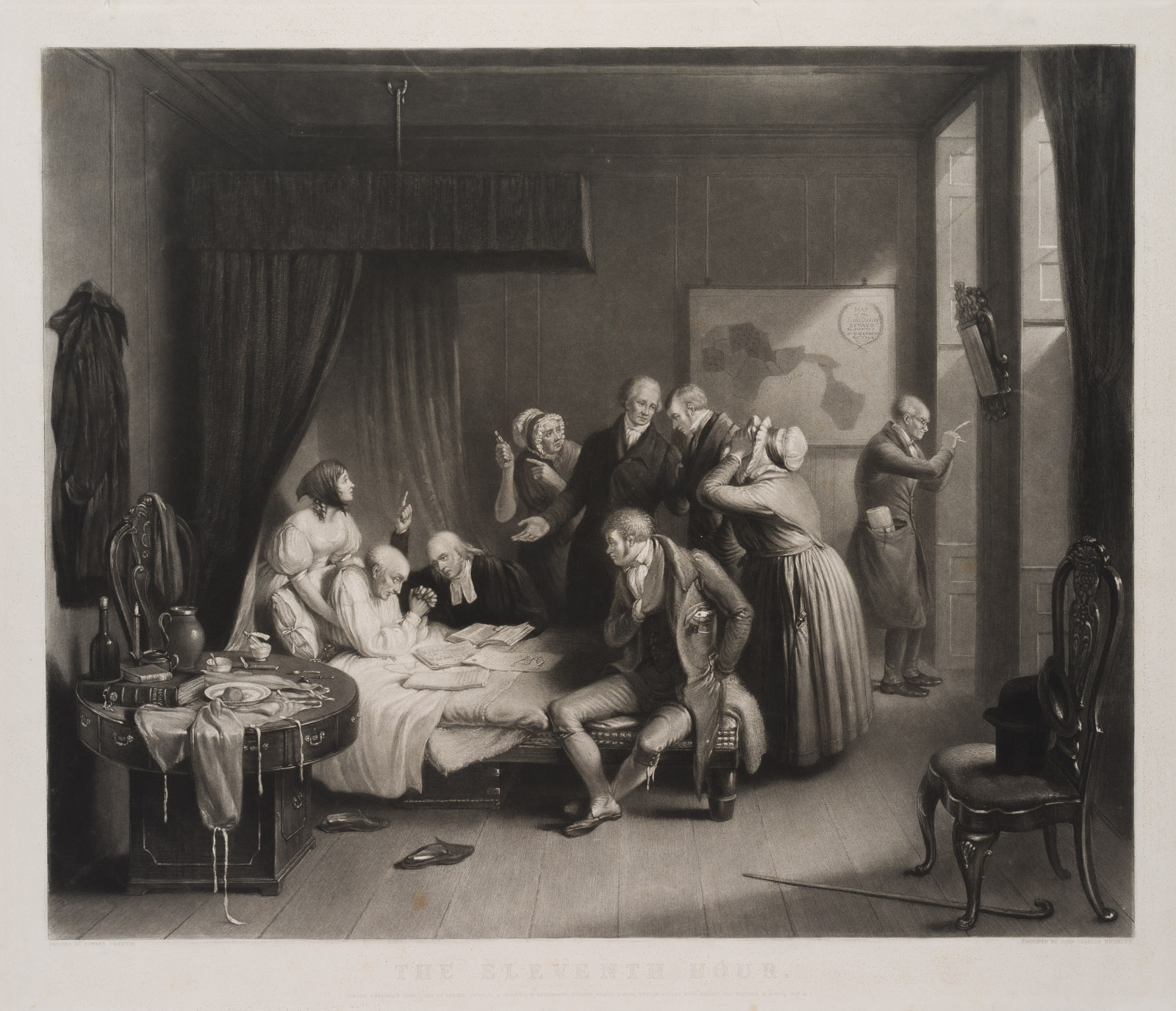 - Description: A man on his deathbed, praying fervently, is admonished by a cleric kneeling at his bedside and pointing upwards. The woman at the side of his head supports him and the other members of the household depicted are also in great distress; to the left, a large round dressing table with small drawers, crammed with crockery, medicines, a mirror, a Bible and clothes; a map hangs on the wall; after Prentis.