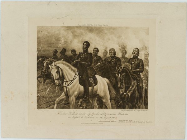 - Beschreibung: bezeichnet “M. Weese pinx.”, “Georg Büxenstein & Comp. Berlin hel.”. Fotogravur nach M. Weese. Der junge Dichter und Dramatiker Theodor Körner zu Pferd an der Spitze der Lützowschen Freischar.