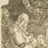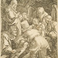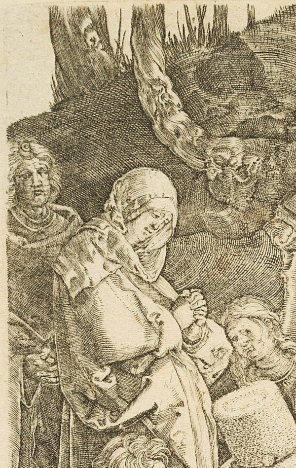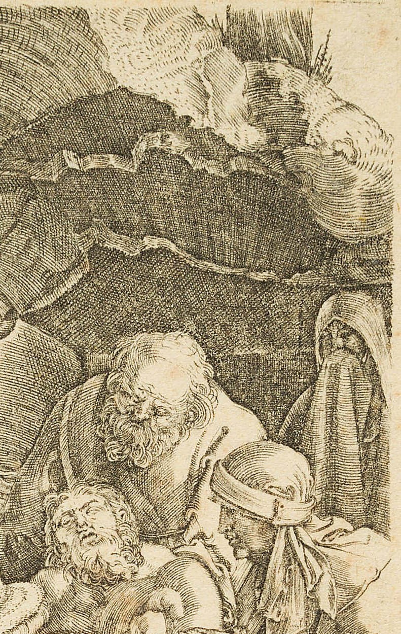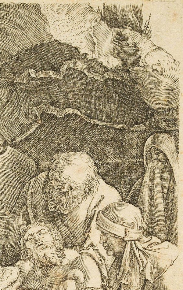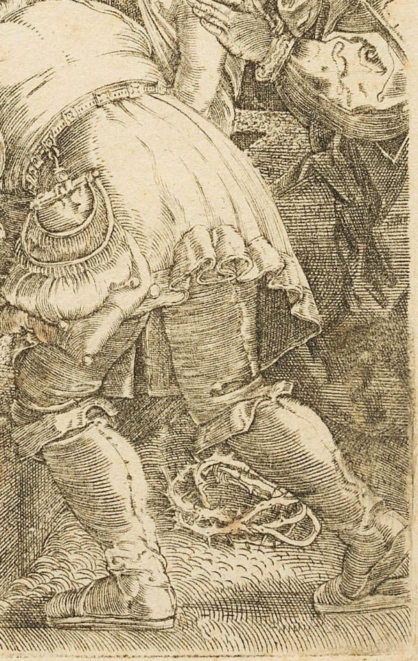 - Beschreibung: Gegenseitige Kopie mit Monogramm und Jahreszahl Dürers. Unten links bezeichnet mit “AD” und “1512”. Die Darstellung entspricht Blatt 13 aus Dürers Kupferstich-Passion, die zwischen 1507 und 1512 entstanden ist. Die Kopie gehört zu den Nachdrucken des Bamberger Antiquars Bundele, die insgesamt eine hohe Genauigkeit aufweisen. Ältere dieser Abdrucke gelten als sehr selten.