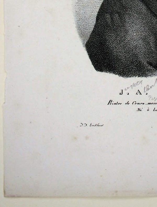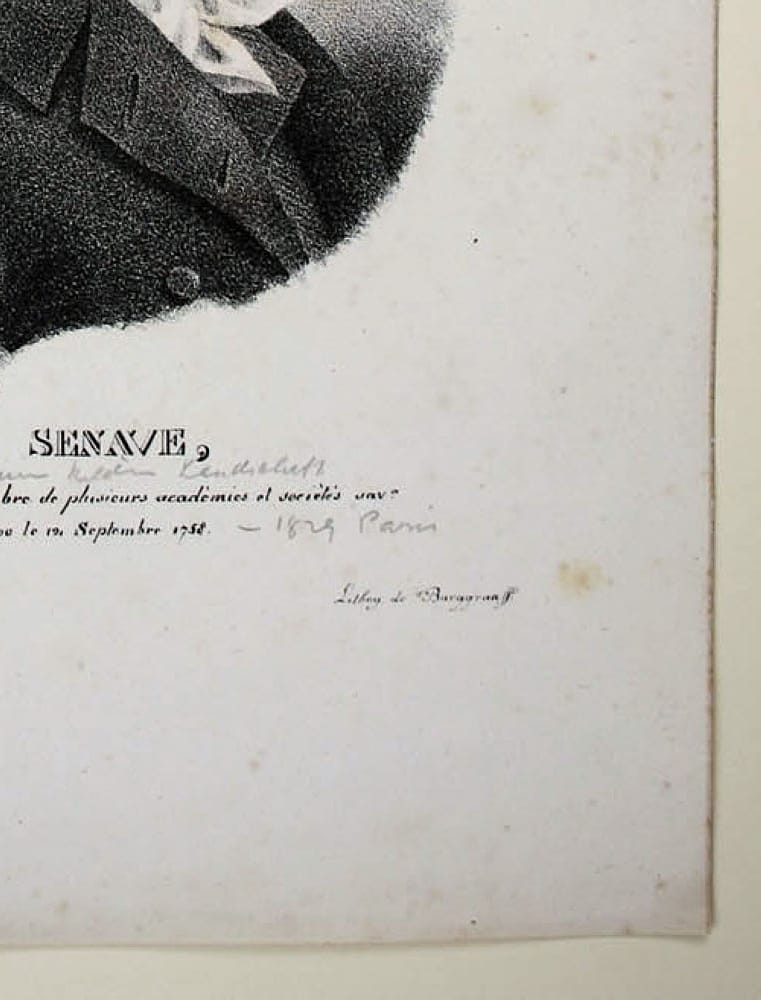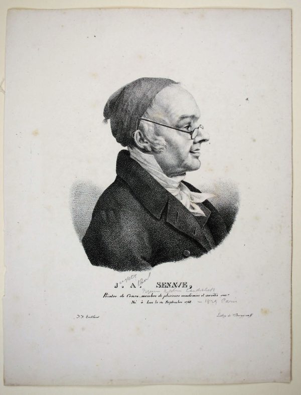 - Description: Lithograph of Burggraaff, inscribed at the bottom: ” J. A. Senave, Peintre de Genre, membre de plusieurs academies et societes sav. Né à Loo le 12 September 1758. J. J. Eeckhout Lithog. de Burggraaff”. Portrait of J. A. Sénave with cap to the right. Burggraaff was a Belgian lithographer active from about 1801 to 1850 at the Royal Academy in Brussels. He was best known for his portraits of contemporary artists. Jacques Albert Sènave (Loo 1758 – Paris 1823) was a figure, landscape, history and genre painter.