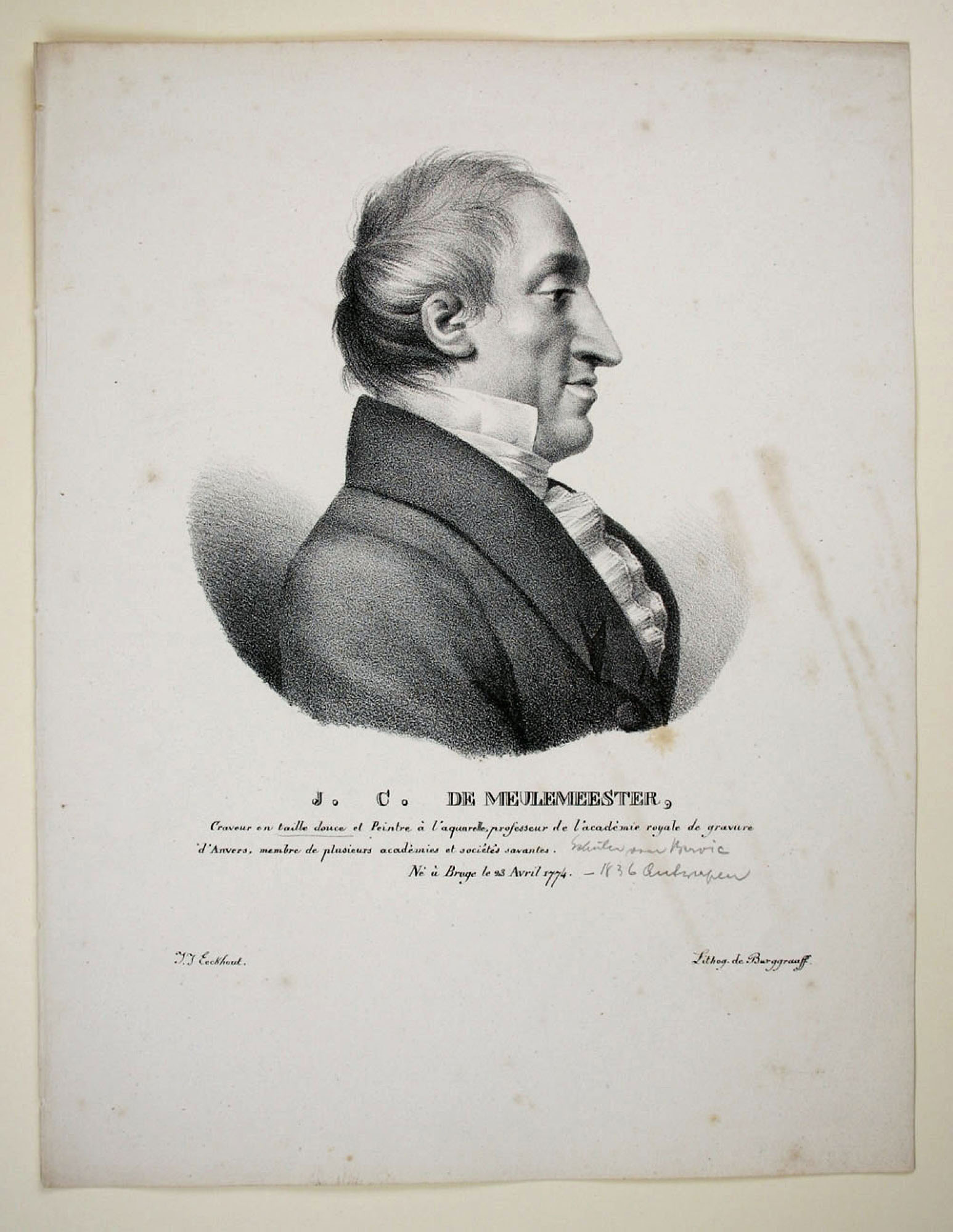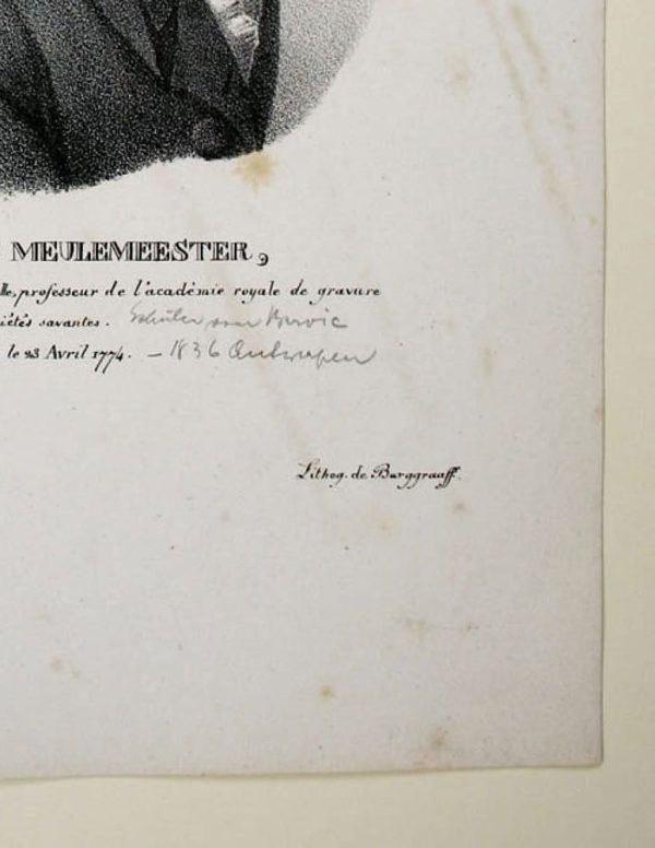 - Description: Burggraaff, Portrait of Joseph Charles Meulemeester, lithograph after Jakob Josef Eeckhout, c. 1830. Description:Lithograph by Burggraaff, inscribed at the bottom: “J. C. Meulemeester, Craveur en taille douce et Peintre l`aquarelle, professeur de l`acadmie royale de gravure d`Anvers, membre de plusieurs academies et societes savantes. N Bruge le 23 Avril 1774″. J. J. Eeckhout Lithog. de Burggraaff”. Portrait of J. C. de Meulemeester in profile to the right. Burggraaff was a Belgian lithographer working at the Royal Academy in Brussels from about 1801 to 1850. He became famous especially for his portraits of contemporary artists. Joseph Charles de Meulemeester (Bruges 1771 – Antwerp 1836) was an engraver. He worked in Rome and Antwerp, among other places.