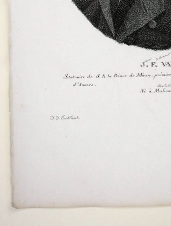 - Beschreibung: Burggraaff, Porträt Jan Frans van Geel, Lithographie nach Jakob Josef Eeckhout, um 1830. Beschreibung:Lithographie von Burggraaff, bezeichnet unten: “J. F. Geel, Statuaire de S. A. le Prince de Mèan, prèmier professeur et membre de l`académie Royale d`Anavers. Né à Malines en Octobre 1756. J. J. Eeckhout Litho. de Burggraaff”. Porträt des Jan Frans Geel nach links. Burggraaff war ein von etwa 1801 bis 1850 tätiger belgischer Lithograph an der königlichen Akademie in Brüssel. Bekannt wurde er vor allem durch seine Porträts zeitgenössischer Künstler. Jan Frans Geel (Mecheln 1756 – Antwerpen 1830) war belgischer Bildhauer.