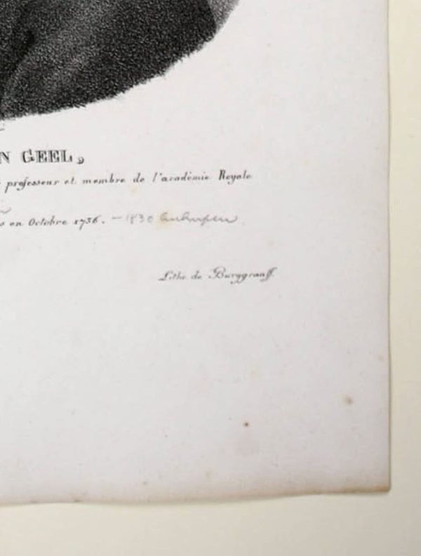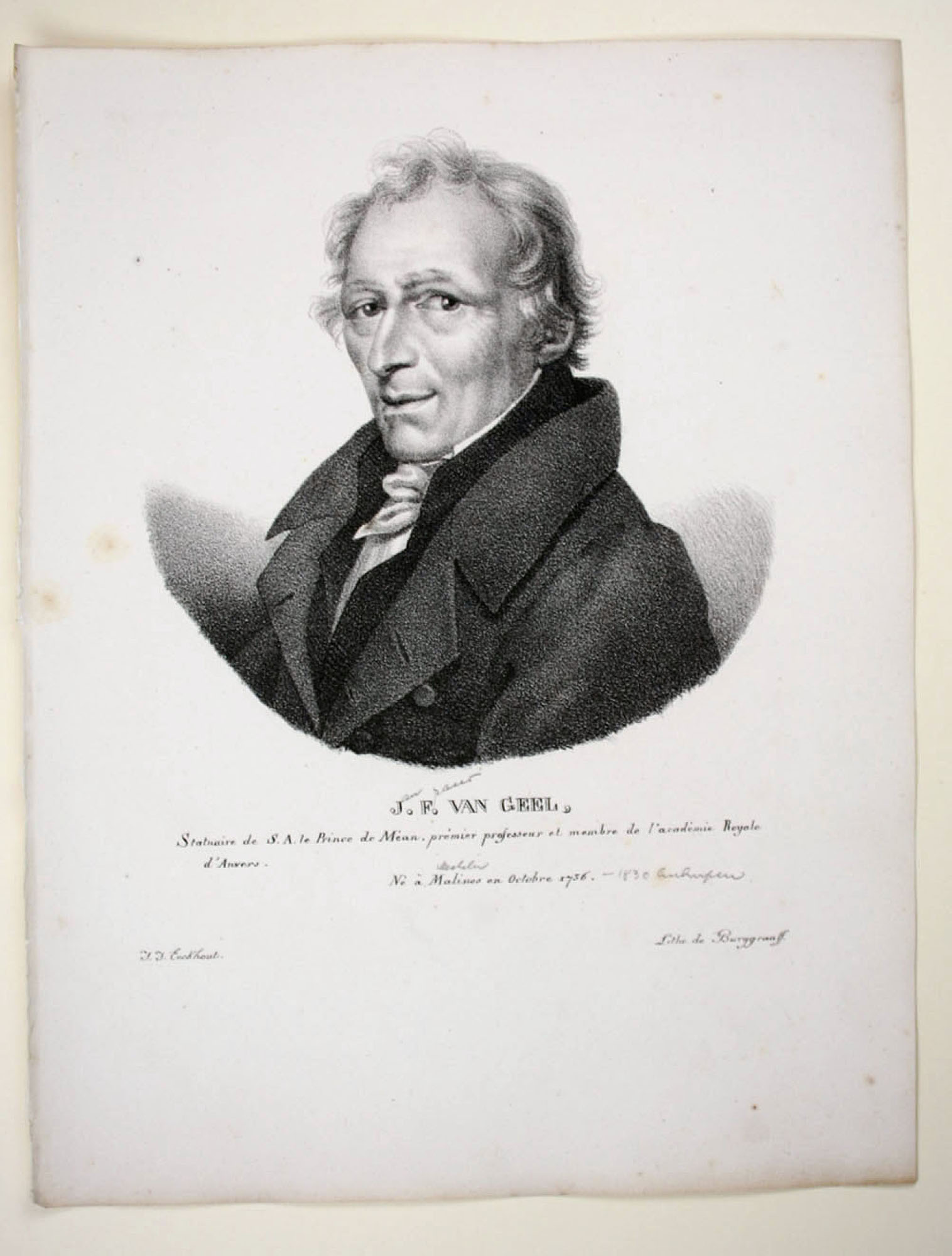 - Description: Burggraaff, portrait Jan Frans van Geel, lithograph after Jakob Josef Eeckhout, c. 1830. Description:Lithograph by Burggraaff, inscribed at the bottom: “J. F. Geel, Statuaire de S. A. le Prince de Man, prmier professeur et membre de l`acadmie Royale d`Anavers. N Malines en Octobre 1756. J. J. Eeckhout Litho. de Burggraaff”. Portrait of Jan Frans Geel to the left. Burggraaff was a Belgian lithographer working at the Royal Academy in Brussels from about 1801 to 1850. He became famous especially for his portraits of contemporary artists. Jan Frans Geel (Mechelen 1756 – Antwerp 1830) was a Belgian sculptor.